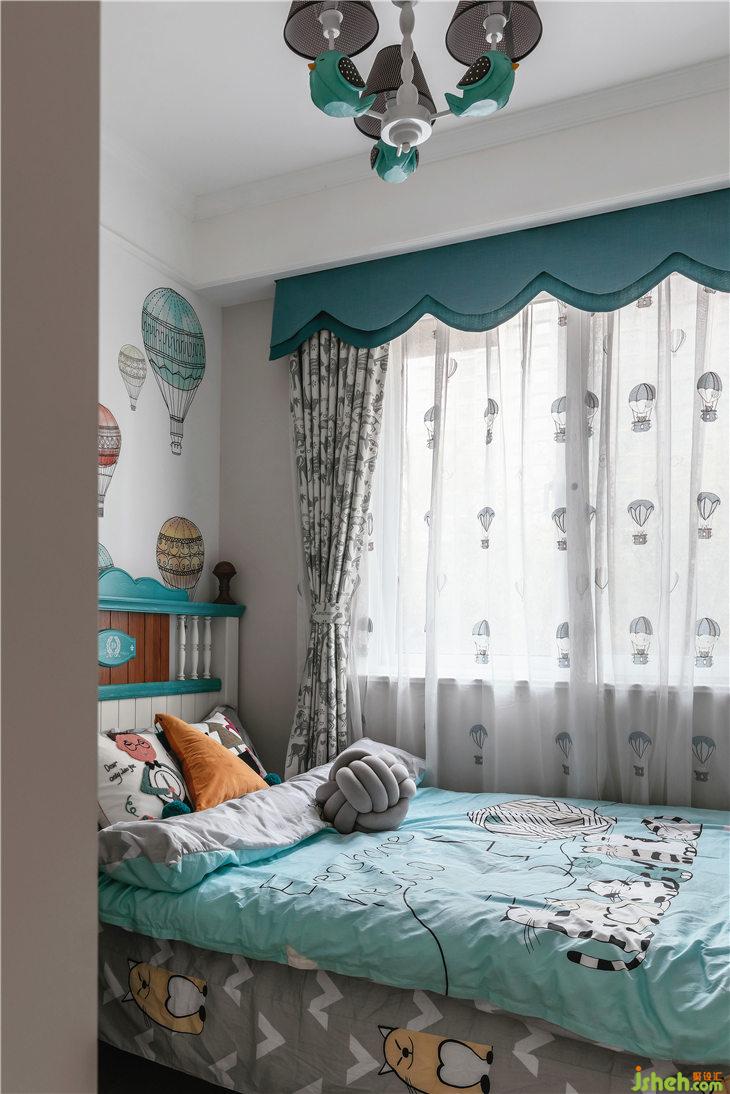 業(yè)主家有個四歲的小男孩,兒童房我們選配了環(huán)保等級很高的美式實木家具,淺孔雀藍配搭玳瑁色原木家具,氣球背景墻布的沙漠紅與成品家具顏色相互呼應(yīng),窗簾的幔頭我們也選配主打淺孔雀藍,比斯開灣藍色收邊體現(xiàn)精致感,貓頭鷹燈具與壁燈造型相映成輝,紗簾上的小氣球,每個細節(jié)都體現(xiàn)了設(shè)計師的用心之處。