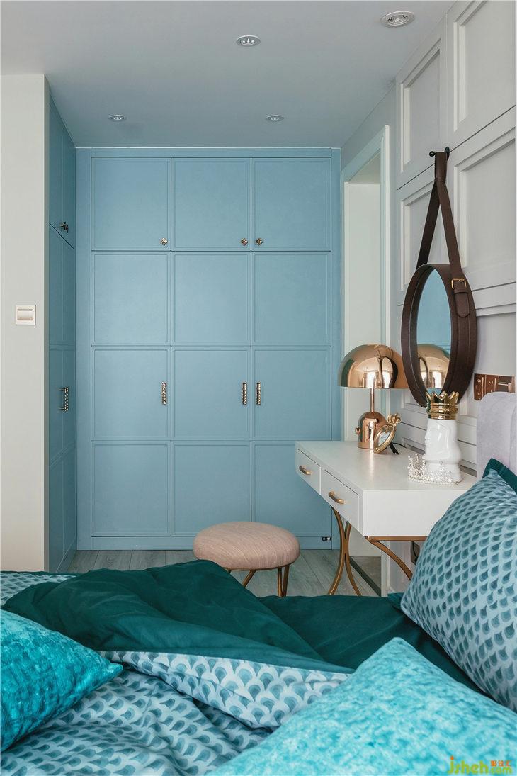 柔和藍(lán)的衣柜與床頭背景等比例切割,點(diǎn)綴精致手工錘紋把手,柔美的靜謐無處渲染。
