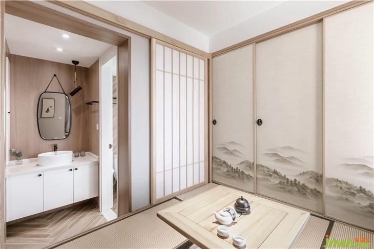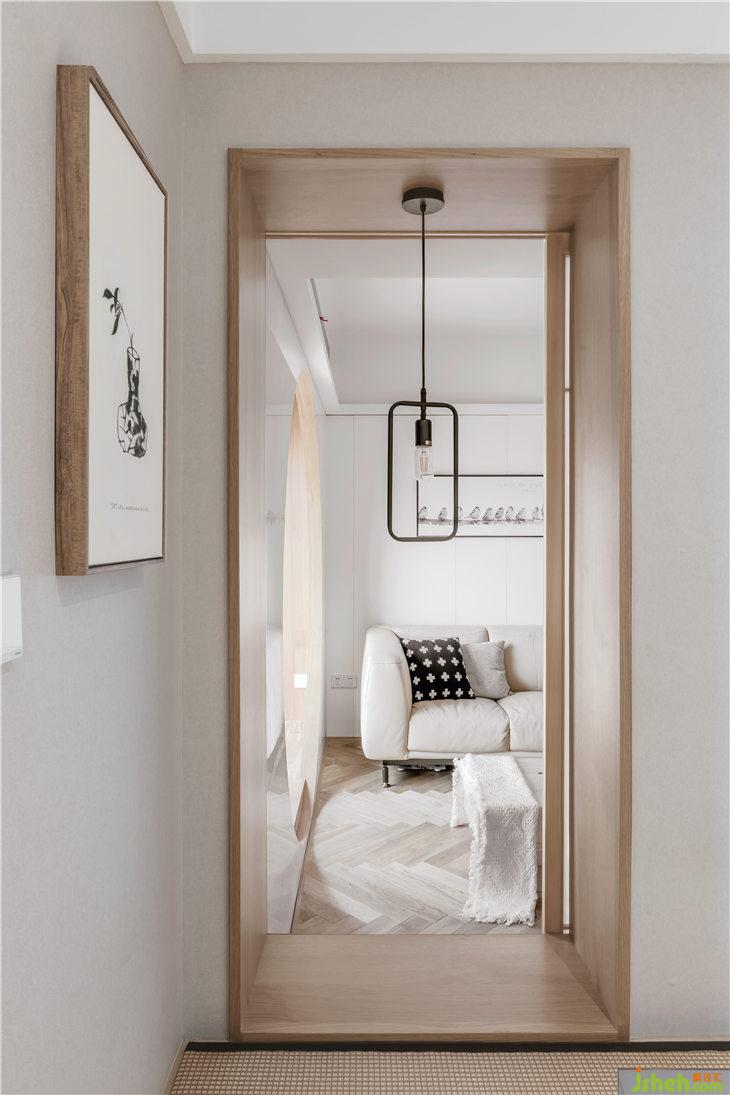 本案例是業(yè)主為父母精心挑選的高層江景房,在11樓的陽臺(tái)處,可以俯瞰到廣闊的濱江風(fēng)景,因此在設(shè)計(jì)中,我們也將外景與室內(nèi)的設(shè)計(jì)相結(jié)合,同時(shí)選擇和室風(fēng)格,貼合業(yè)主父母的審美需求,大量KD板木飾面、木地板和白色護(hù)墻及乳膠漆搭配,也使空間更具安逸寧靜的氛圍。