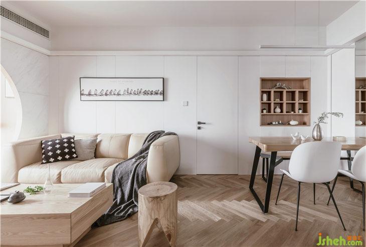 客廳地面鋪設(shè)人字地板,門套以及移門皆使用和室風(fēng)格的木質(zhì)材料,沙發(fā)背景墻白色護(hù)墻,豎向抽縫,與主臥門材質(zhì)統(tǒng)一,融為一體;客廳陽臺(tái)飄窗,是最佳的觀景空間,我們將飄窗打造為一個(gè)休閑空間,讓這里成為品茶閱讀的休閑觀景臺(tái)。