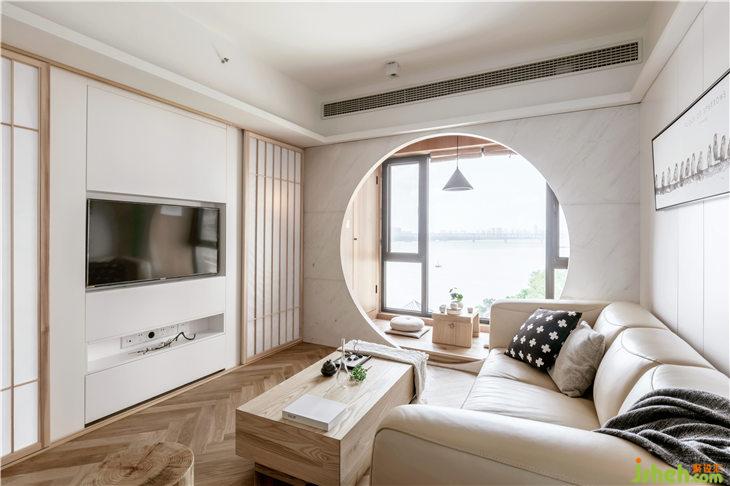 在客廳的飄窗設(shè)計了圓拱造型,形成了圓形的取景框,營造一種富有詩意的畫面感。整個空間的木色飾面,使用KD板材料,更加細(xì)膩和整體。