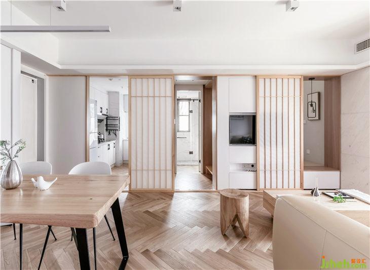 客廳電視背景這側(cè),廚房的門洞與干區(qū)的門洞進(jìn)行等大小規(guī)劃,兩扇一般大的日式移門平均放置,上下軌道通長布置,移門可以隨時滑動,這樣就使兩扇移門變成有趣的背景,讓這面背景墻變得更加整體。