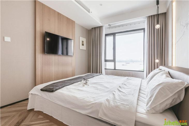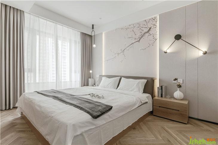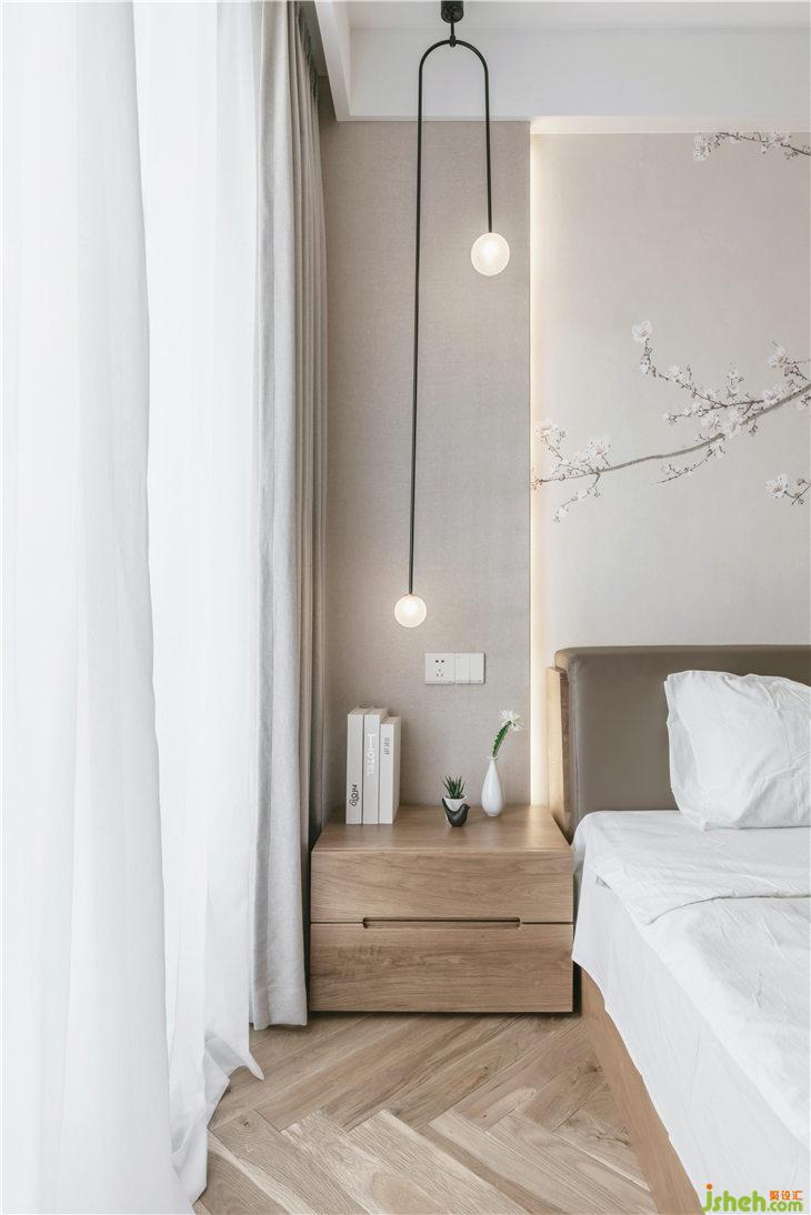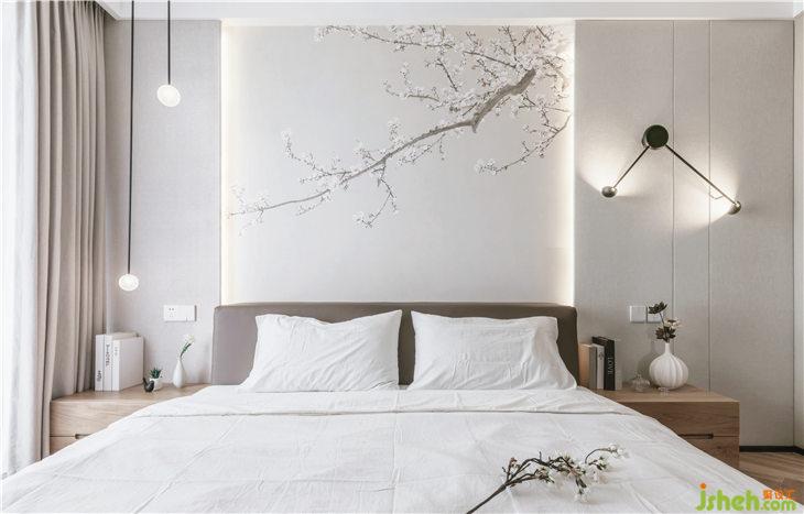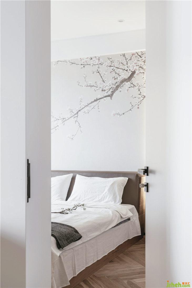 主臥地面延續(xù)客廳的人字地板鋪貼,背景墻使用硬包并抽豎縫,與客餐廳背景墻的抽縫相呼應(yīng);兩個床頭柜上方,選用壁燈和吊燈的不對稱設(shè)計,使得空間更加活躍靈動,床背景中間點(diǎn)綴梅花枝葉壁畫,一幅東方禪意之美應(yīng)運(yùn)而生,主臥右側(cè)內(nèi)藏了一個完整的衣帽間,延用了日式隔斷移門無地軌的設(shè)計,這幾處門的設(shè)計又恰到好處的詮釋了我們的風(fēng)格定位。
