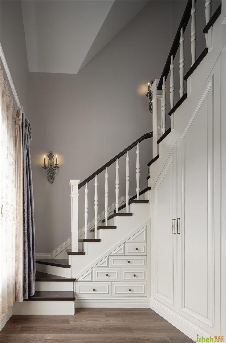 這里是通往頂樓衣帽間的樓梯間,樓梯下方我們也充分利用,定制了抽屜柜,增加儲藏,點綴式的把手精致了一個樓梯間。