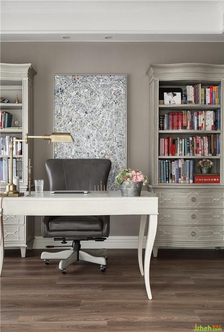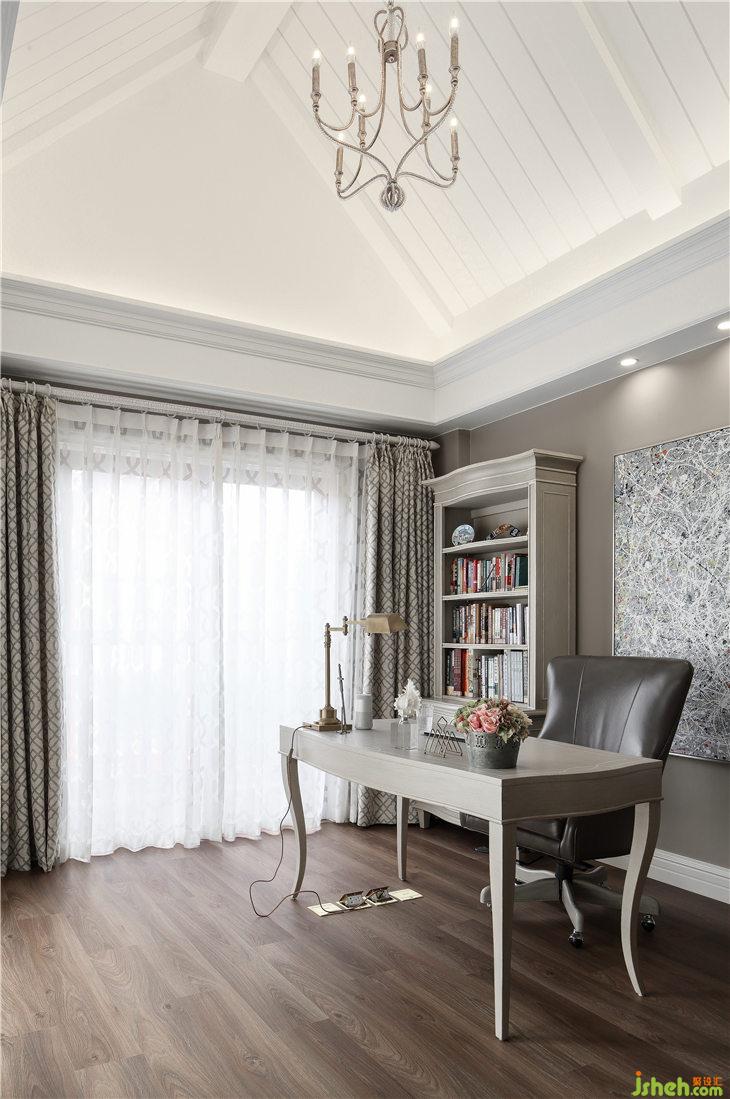 書房頂部保留原始建筑造型的尖頂,石膏板線條抽縫造型讓頂部細節(jié)層次豐富,墻面的淺米灰色乳膠漆寧靜淡雅,與家具、軟裝的搭配也是相得益彰。