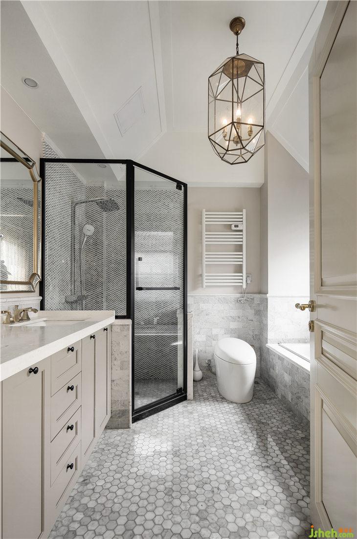 主臥衛(wèi)生間延續(xù)二樓客衛(wèi)手法,地面,選用了淺色六邊形馬賽克大理石地磚,墻面同色長形小磚,整體色彩、材質(zhì)統(tǒng)一和諧。淋浴房墻面背景,選用小紋理的馬賽克磚,質(zhì)感細膩。