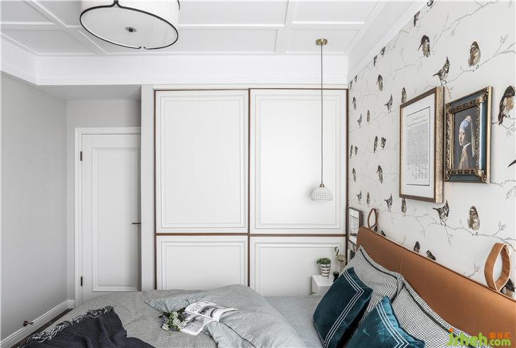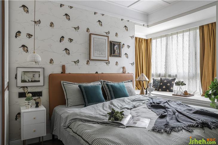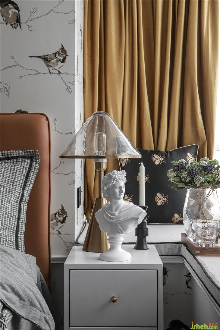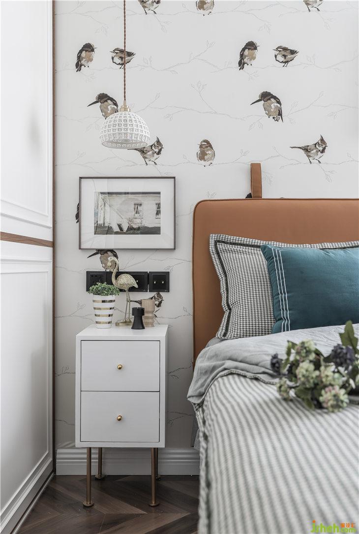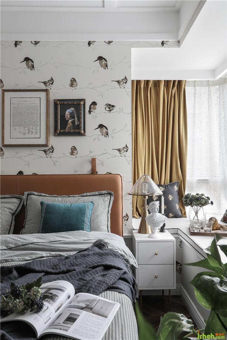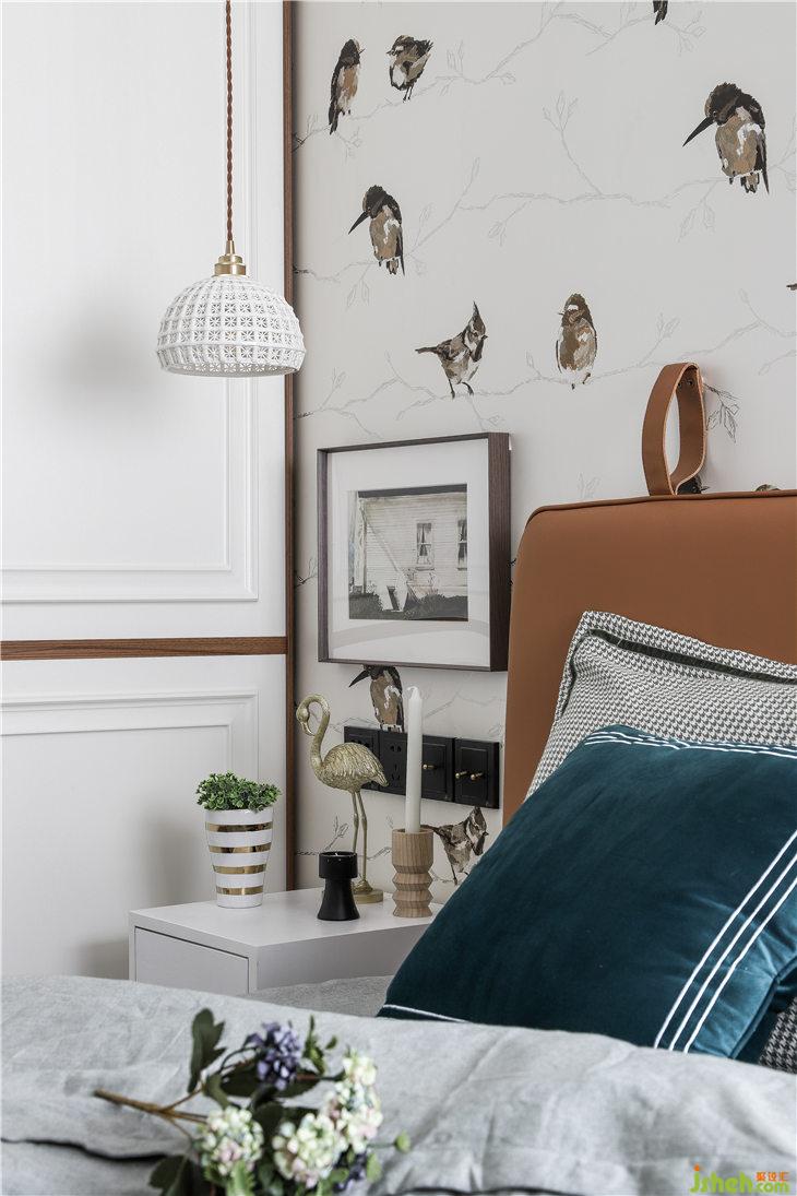 背景是一幅珠光質感的花鳥壁紙,床頭非對稱的復古裝飾畫美麗別致,增添了空間的靈動趣味。
