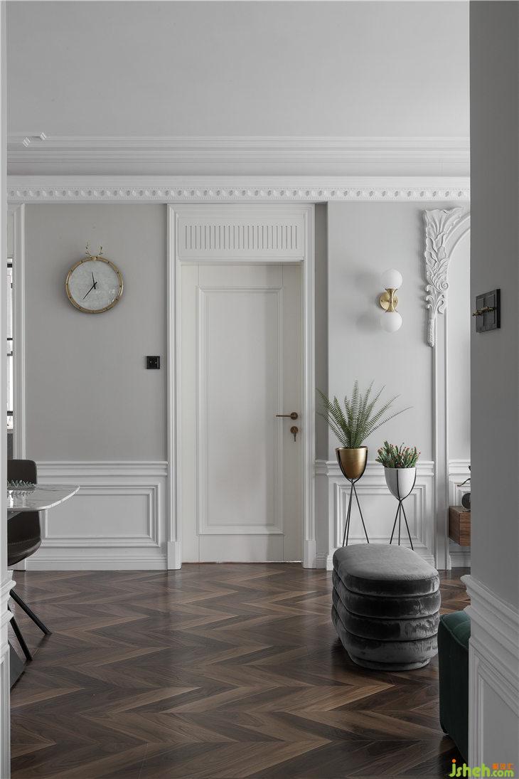 奢華銅制小鹿頭天然貝殼石英掛鐘壁掛在次臥與廚房的墻體中間,客餐廳的門我們都采用了通高的形式,上門頭板抽縫飾面,拉伸了整體層高,體現(xiàn)空間的氣質品味。