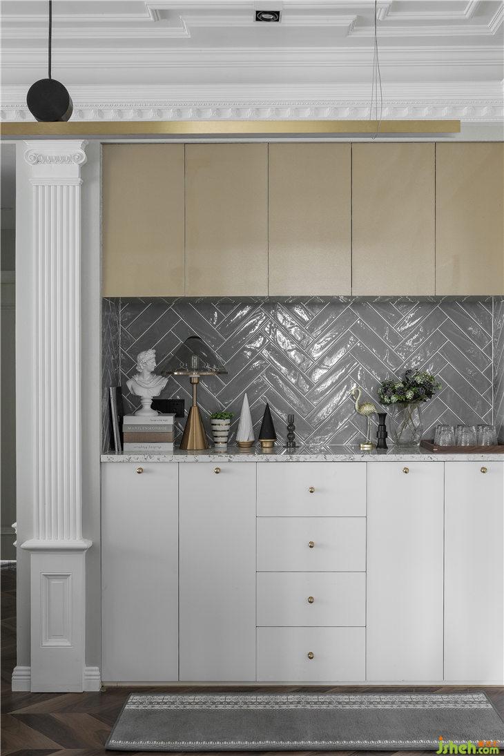 餐邊柜旁的墻體是結構柱,拆除不了,所以一個復古羅馬柱作為裝飾彌補了這個寬面的空缺,又很好的融入了整體復古的調性當中。