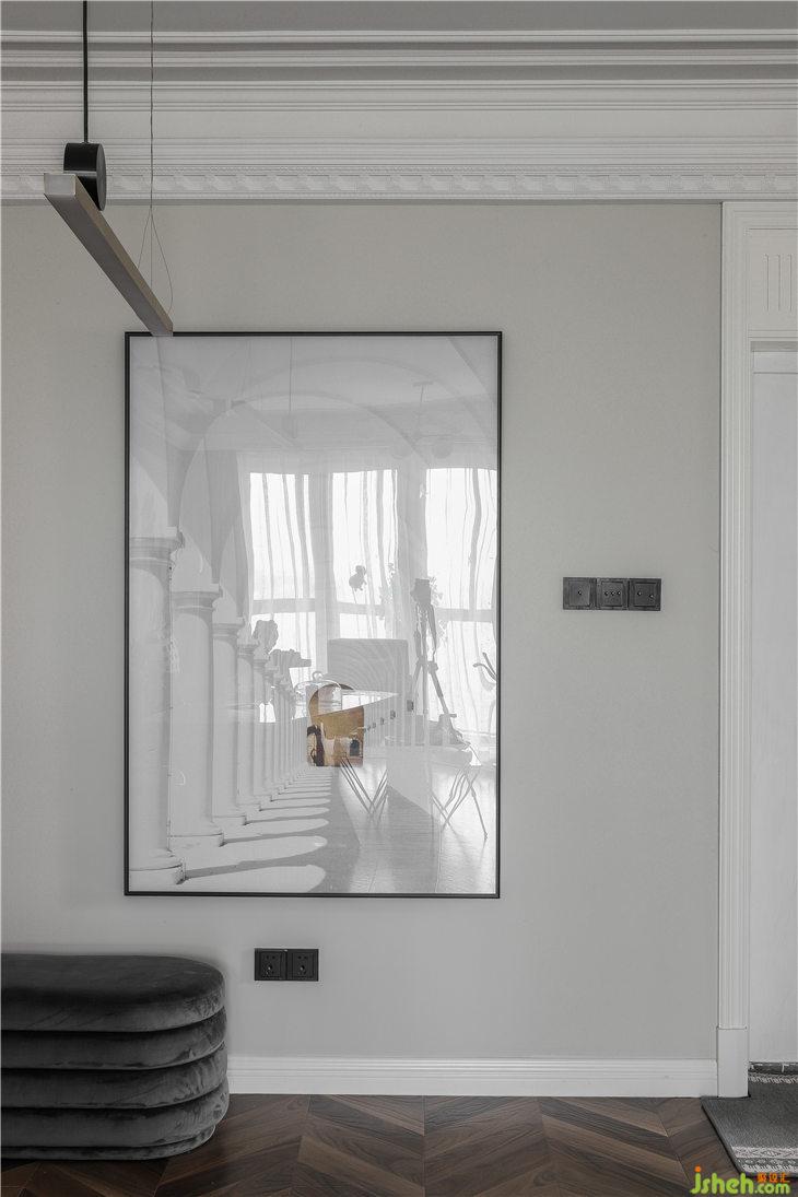 過道中的復古裝飾畫組合富有現(xiàn)代懷舊的詩意之美。