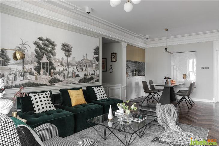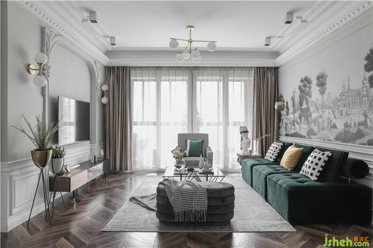 客廳的軟裝選擇上,我們用了經(jīng)典祖母綠的絲絨沙發(fā),搭配現(xiàn)代經(jīng)典造型的千鳥格單人沙發(fā)和灰色絨面弧形榻凳,營造了整體大氣卻不失精致感的雅致韻味。吊頂與電視背景墻壁燈,選用了同系列樣式,香檳金屬結合白磨砂燈泡,增添了高雅的氣質。