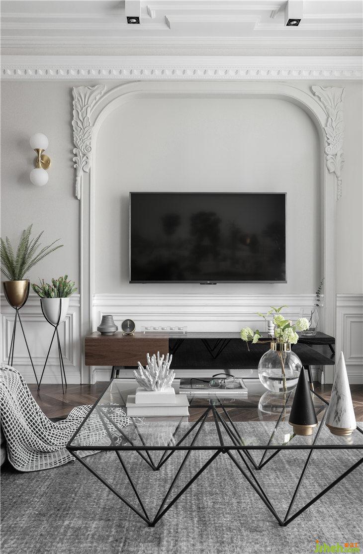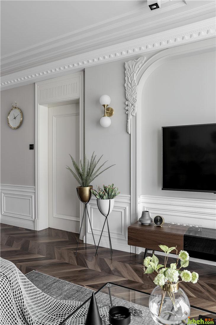 電視背景墻,原始結構的一側有承重墻凸出,我們將相對一側同樣加厚拉平,中間形成一個框洞,使用PU線條進行裝飾結合拱形角,扣上我們定制雕刻的一對石膏花角線(花角一個500大洋,電腦雕刻,只此一對),讓墻面更加豐富與生動。