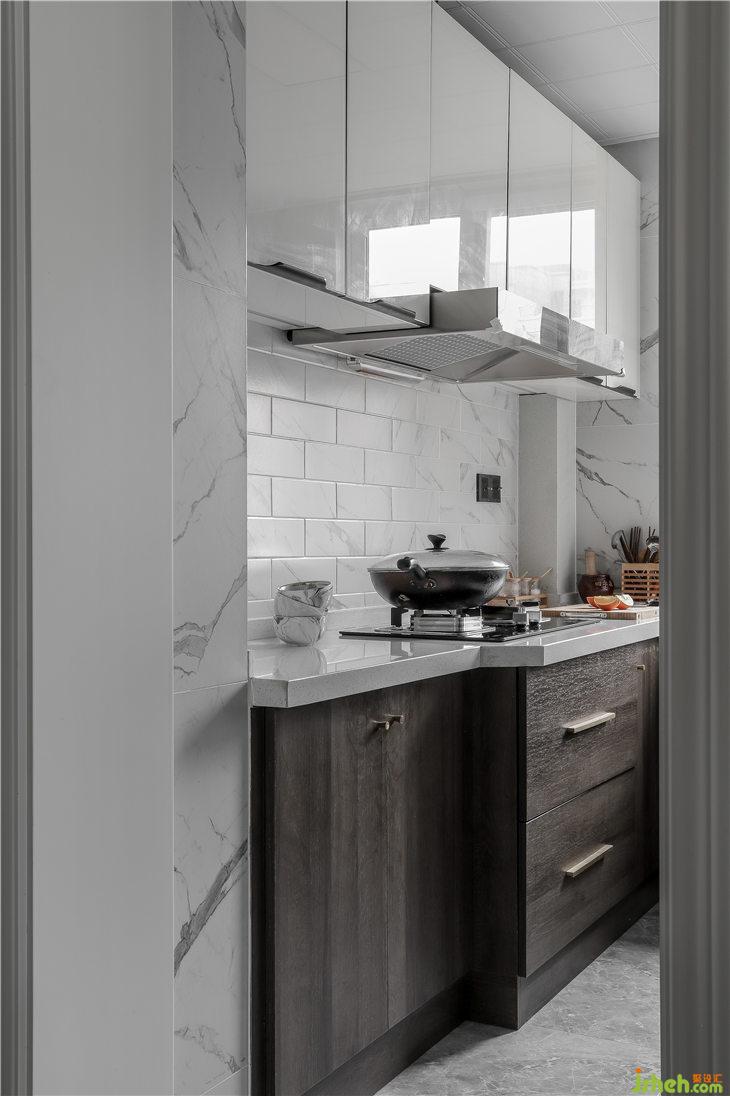 墻面整體魚肚白紋理瓷磚,吊柜與地柜之間選用了大理石紋理的面包磚,同樣都是溫潤的啞光效果,讓廚房不會顯得那么冰冷,地面磚選用了啞光灰色的大理石紋理磚,耐臟同時便于打理。