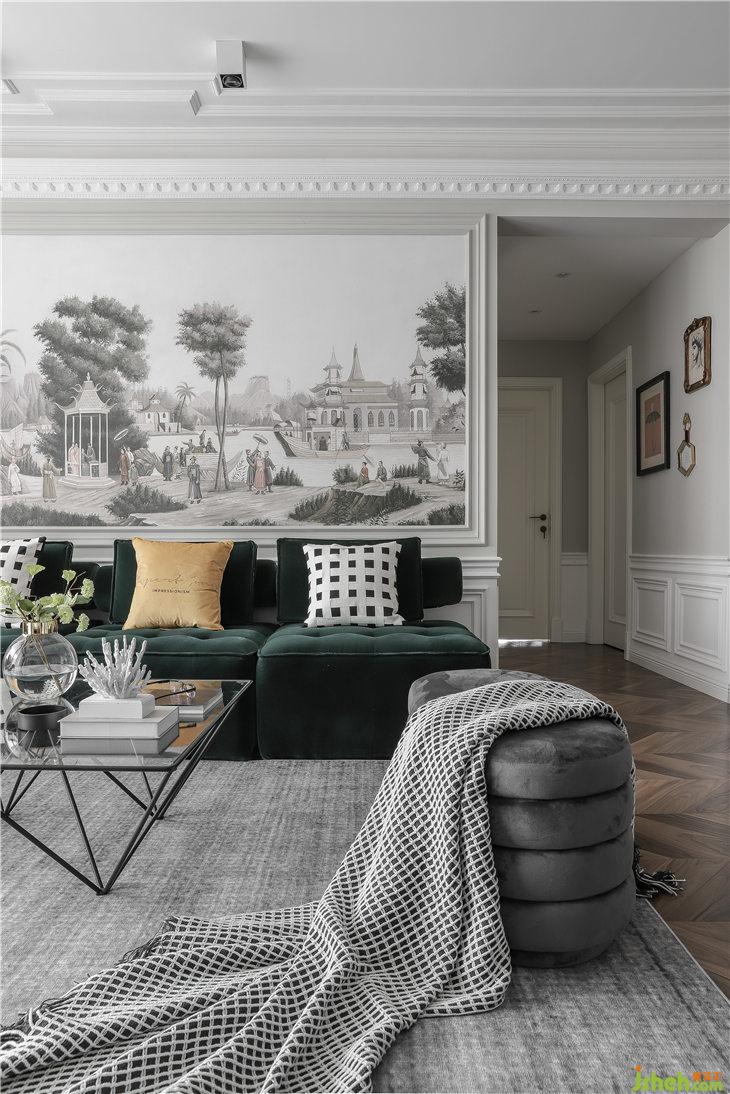 客廳整個空間,色彩表達素雅,以白色和淺灰色為基調(diào),地面選用胡桃木色魚骨拼地板,飽滿沉穩(wěn),有很好的居住舒適感。墻面下裙與上墻灰色乳膠漆區(qū)分開來,使用PU線條做雙層腰線,中間圍合制作框線,白色乳膠漆飾面,有半高護墻板既視感。
