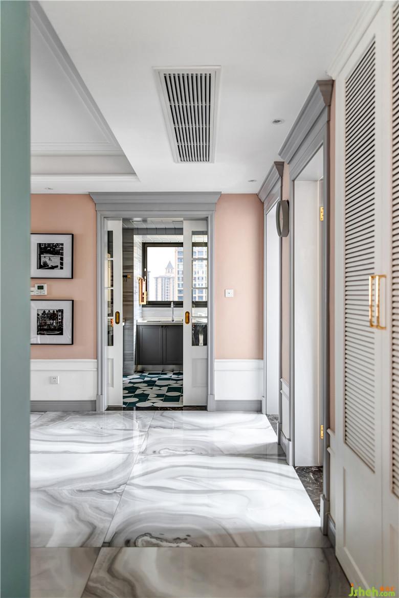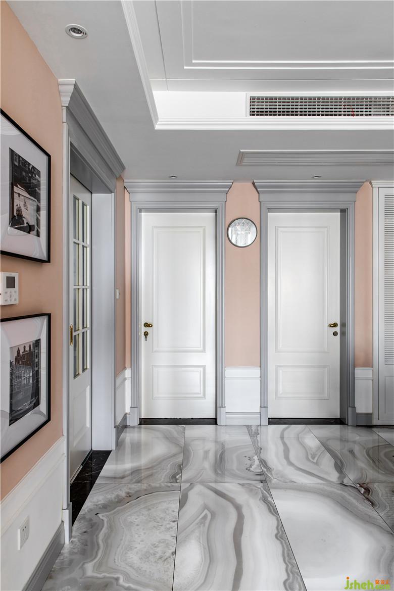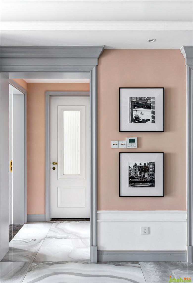 門頭線條,延續(xù)整個(gè)空間,同門套和踢腳線,選用煙灰色,與白色半高護(hù)墻、粉色墻面,三色相呼應(yīng);地面,大膽地選用了貝殼紋的地磚,一式六片,穿插鋪貼,亂而有序。