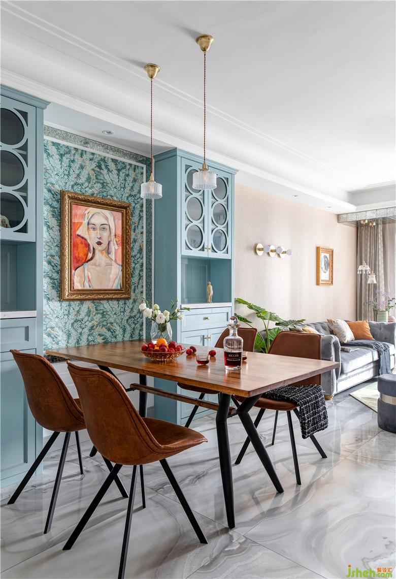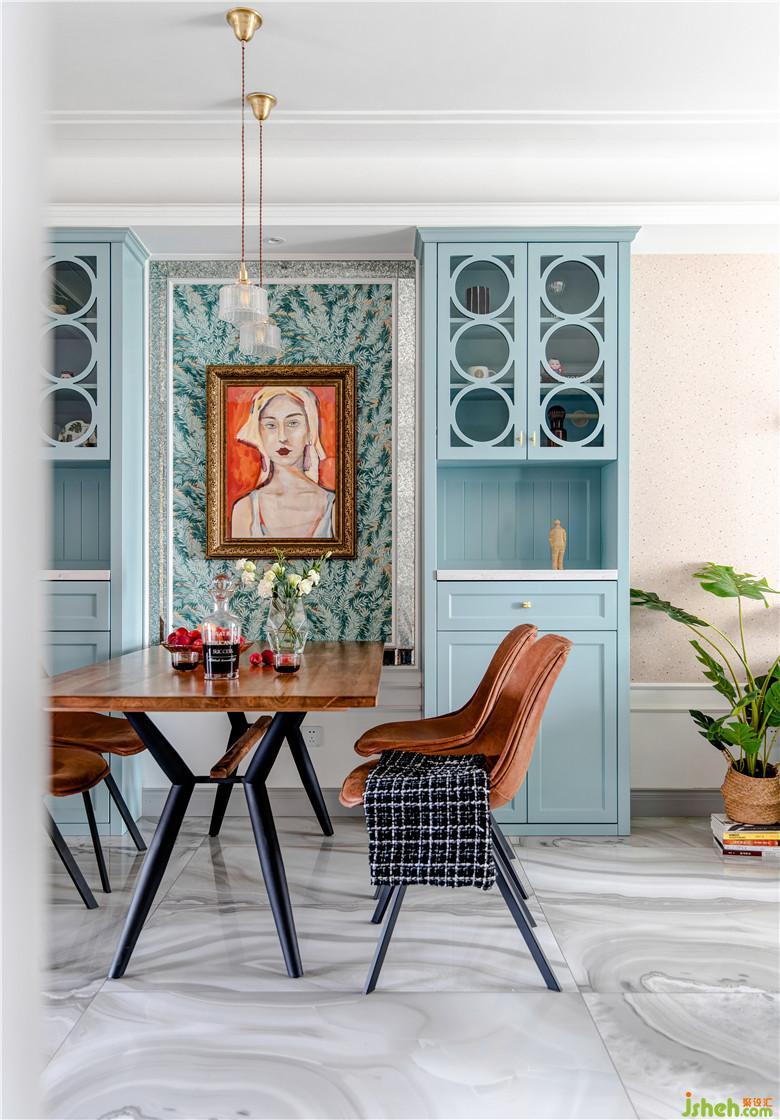 餐廳與客廳通長(zhǎng),餐廳設(shè)計(jì)了一組對(duì)稱的酒柜,劃出餐廳的界限,集收納與展示一體,柜體間內(nèi)嵌一面背景墻,選用了另一款與柜體同色系的壁紙,四周使用復(fù)古鏡面玻璃收邊,材質(zhì)的變化更替,也讓空間層次更加豐富。