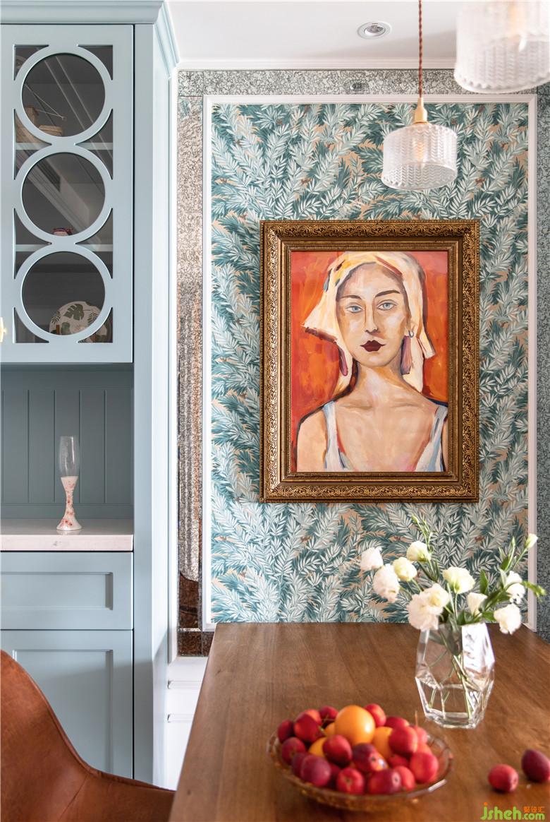 餐廳背景的裝飾畫,一副暖色調(diào)人物畫像,特意找了畫師繪制,與墻紙和柜體色彩形成反差對(duì)比,畫框也通過小樣,多次對(duì)比篩選,注重每一個(gè)細(xì)節(jié)。
