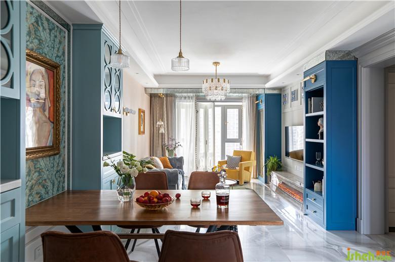 客廳整體色彩層次豐富,但遵循統(tǒng)一呼應(yīng),沙發(fā)背景選用粉色壁紙,電視背景選用與餐廳淺藍(lán)色柜體同色系的深藍(lán)色,主吊燈與餐廳吊燈材質(zhì)統(tǒng)一,與陽(yáng)臺(tái)間下掛的建筑主梁,低于吊頂高度,而且較寬,區(qū)域相對(duì)壓抑,這里使用了車邊仿古鏡包裹,讓空間打開。