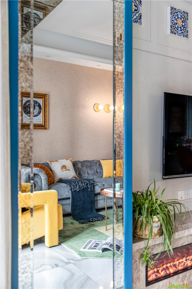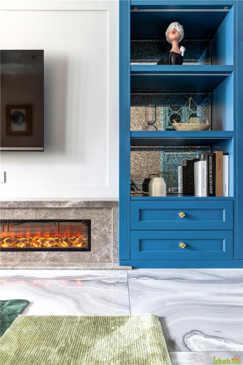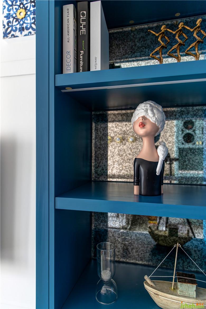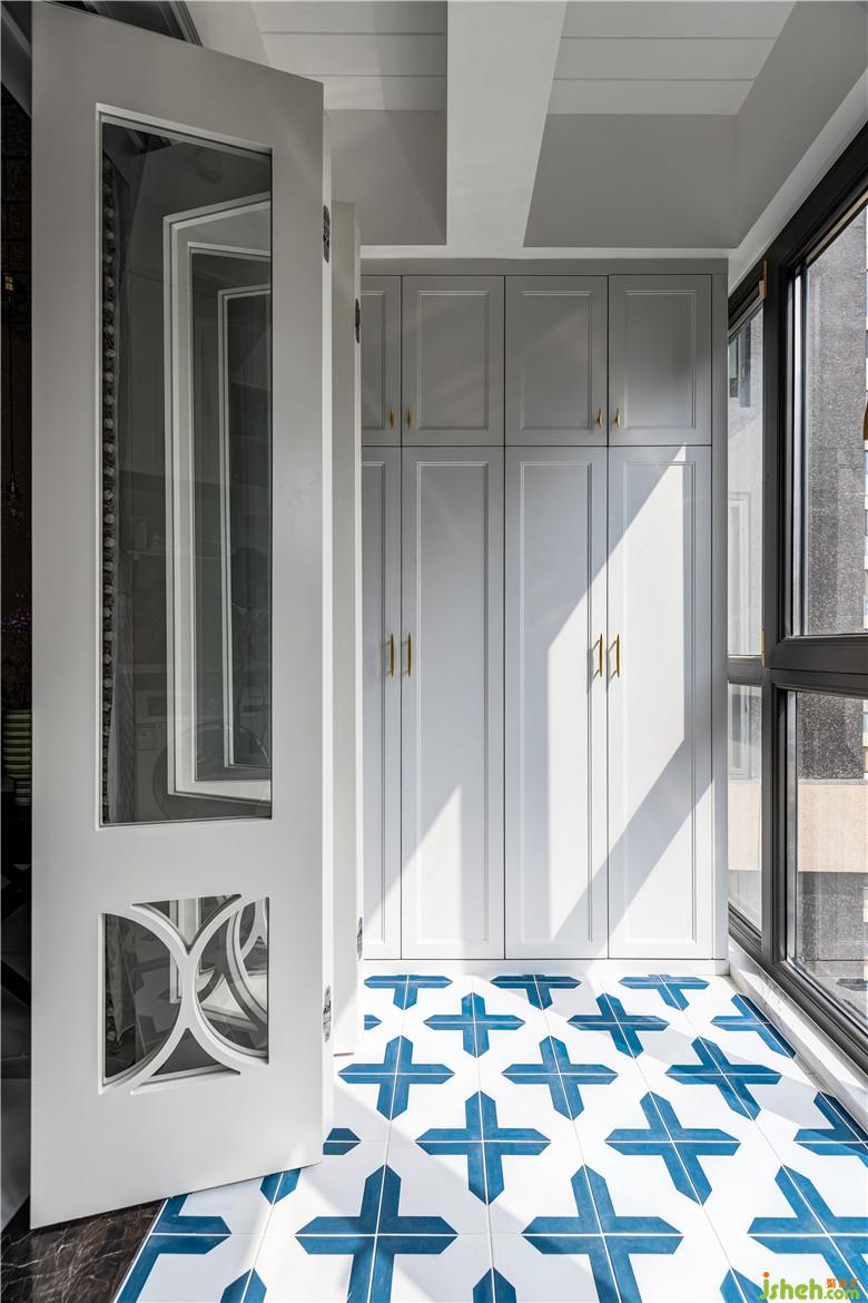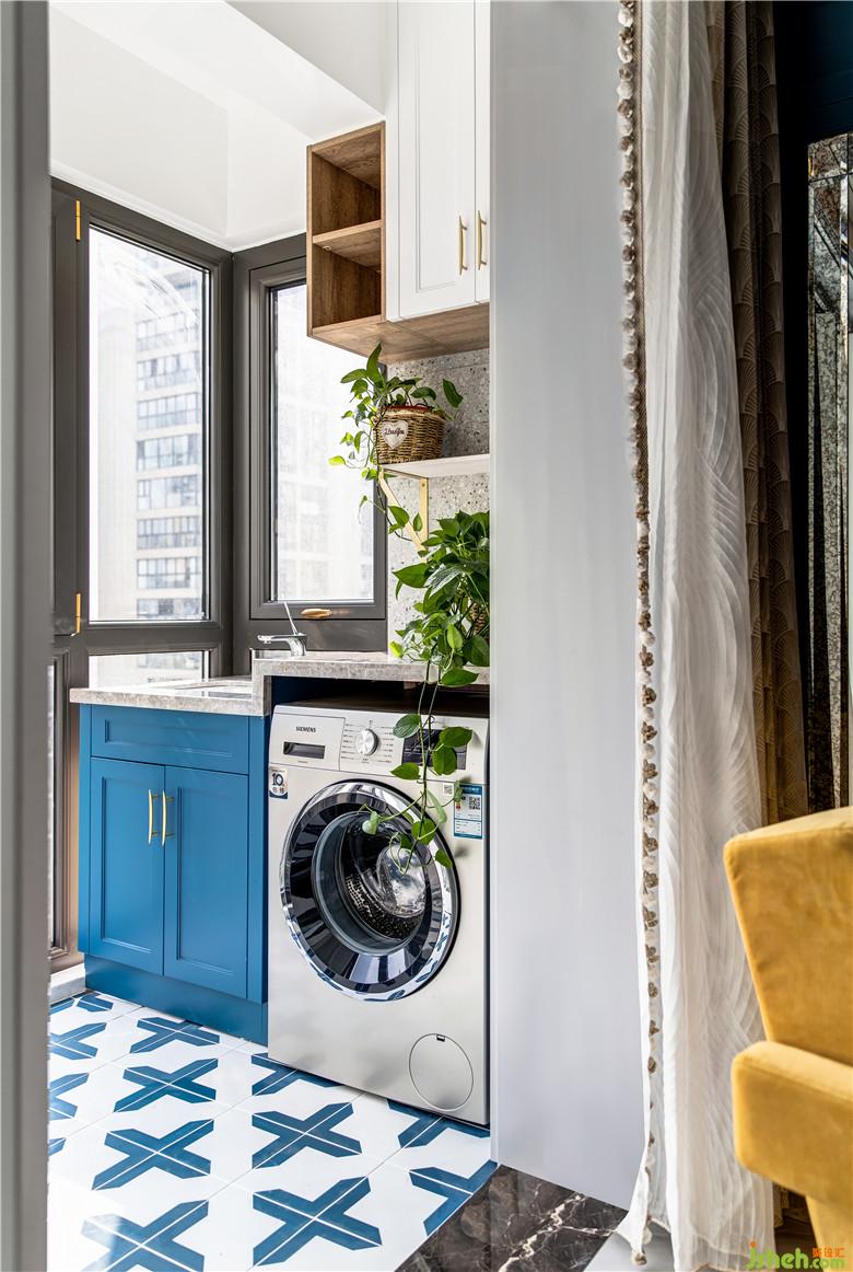 陽臺一側(cè),洗漱池與洗衣機(jī)臺面高低錯落,頂部有效的空間都定制了收納柜,顏值與功能兼得;地面選用藍(lán)色系拼花地磚,呼應(yīng)整體色調(diào)。