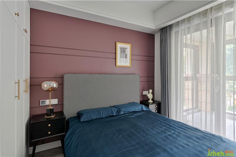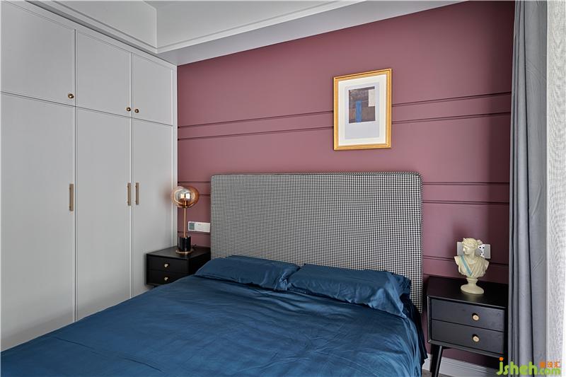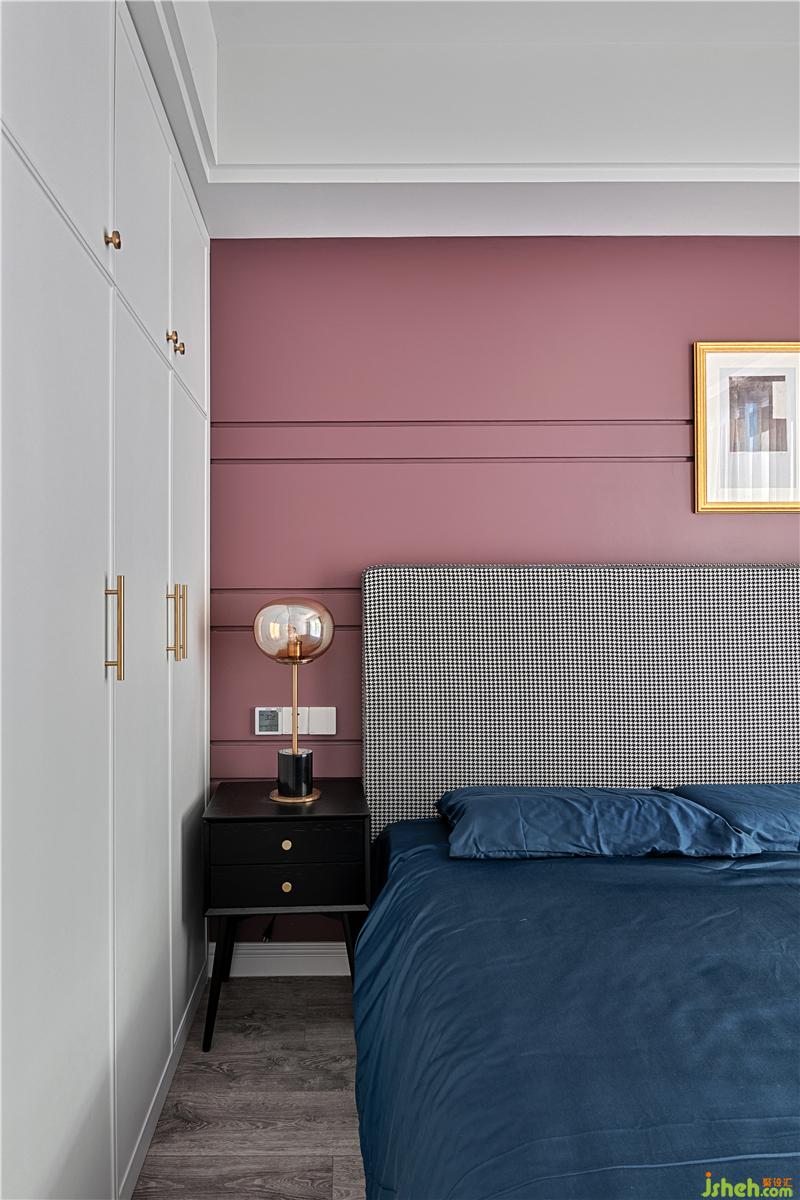 次臥的配色稍顯清新一些,靠頭墻面采用了比較流行的臟粉色,與千鳥(niǎo)格床相呼應(yīng)。