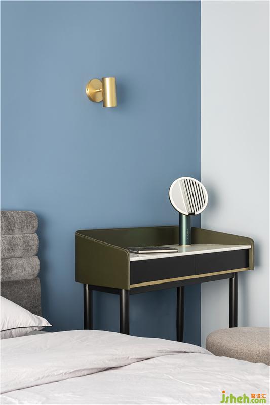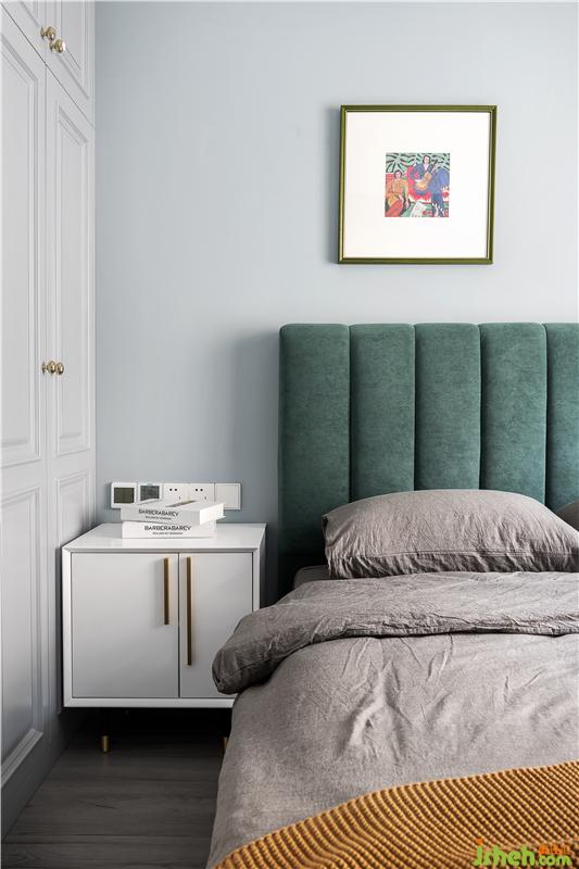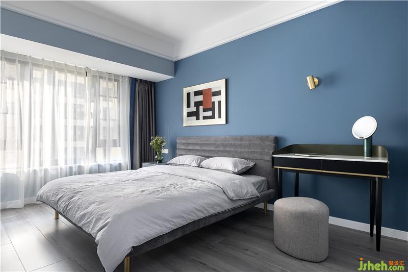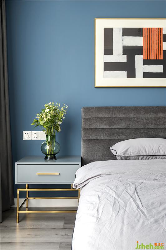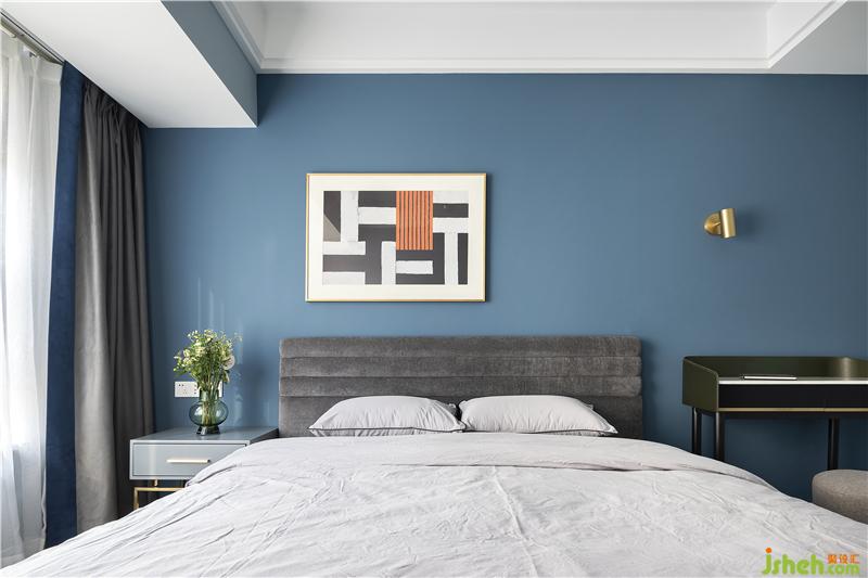 藍色的背景墻加上簡約的裝飾畫,清新而大氣。深色的簡約大床呼應睡眠空間的整體風格,更顯穩(wěn)重大方。