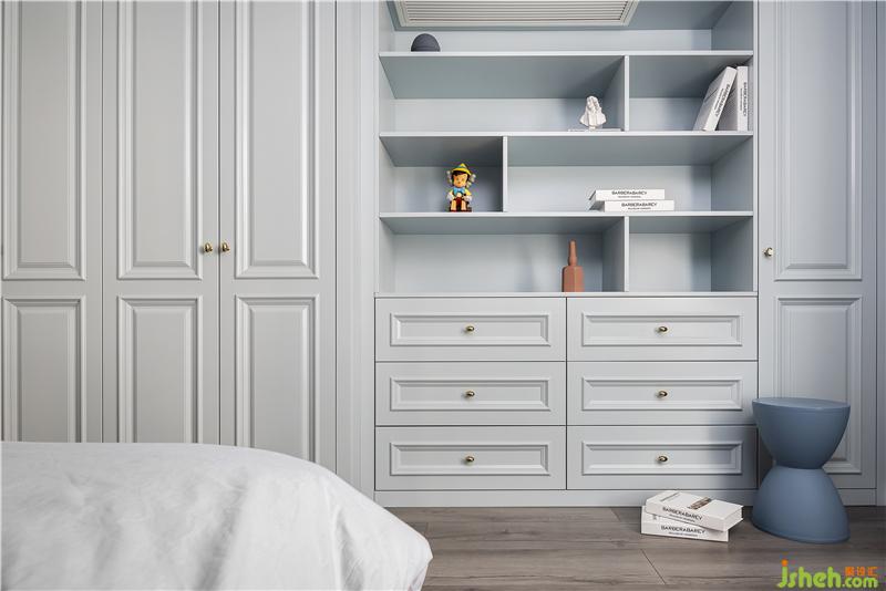 次臥空間風格與主臥相呼應,整個空間設置了大面積的柜子,充分滿足屋主的收納需求。