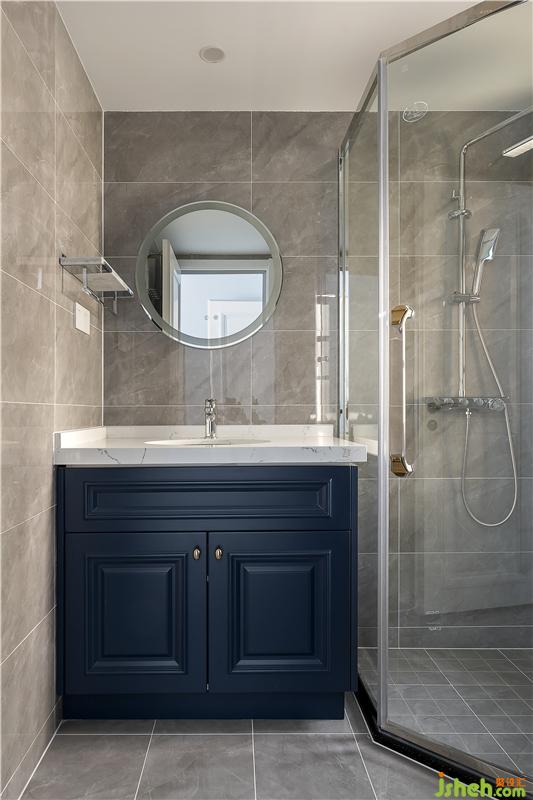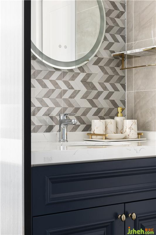 衛(wèi)浴空間墻面鋪滿魚骨形狀瓷磚,結合圓鏡和藍色的抽屜柜,優(yōu)雅之感應運而生。