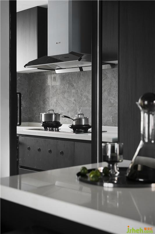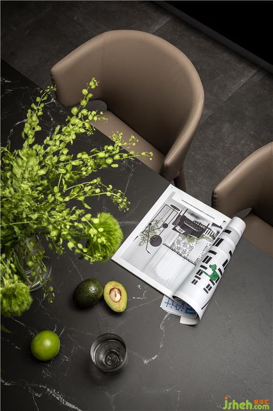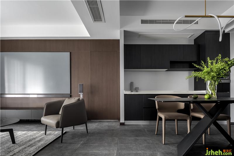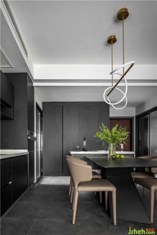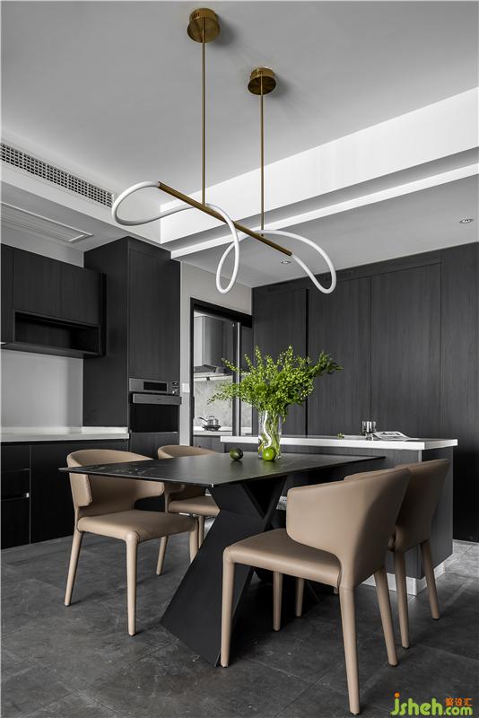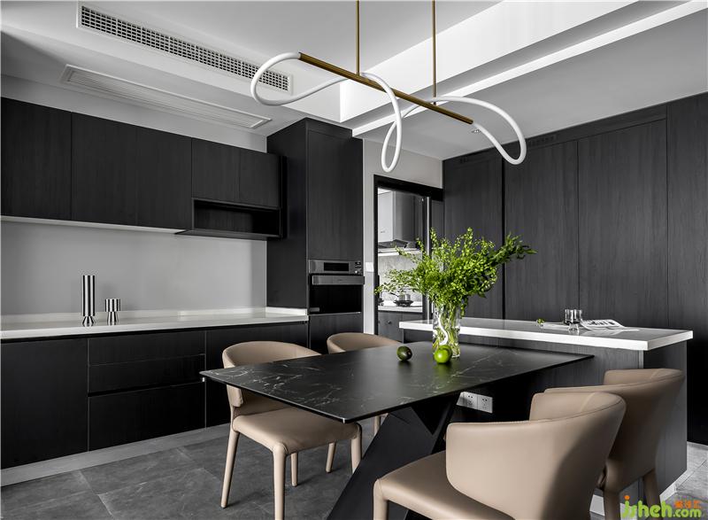 餐廳與西廚結(jié)合在一起,餐桌連接島臺,方便操作,也增加時尚感