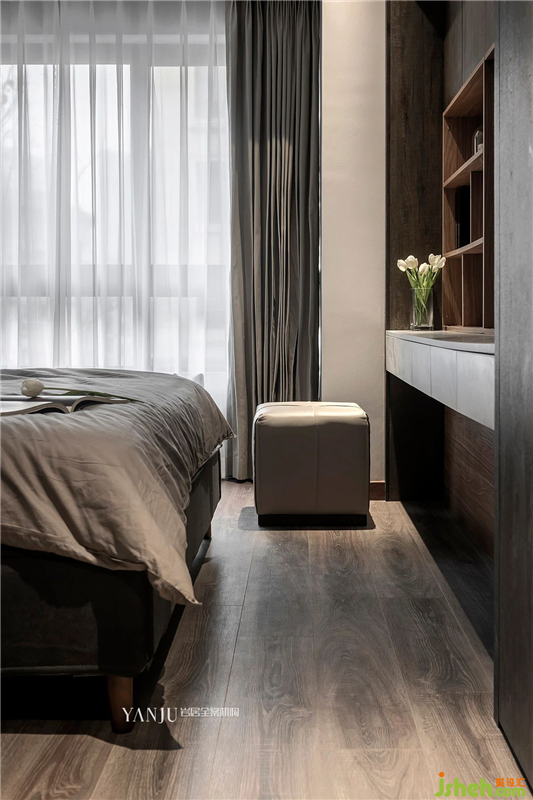 在床尾衣柜的設(shè)計(jì)上,巖居設(shè)計(jì)打造了一個集收納、梳妝臺、電視柜等多種功能于一體的設(shè)計(jì)方案,解決了居住者一直以來面臨的臥室收納問題。