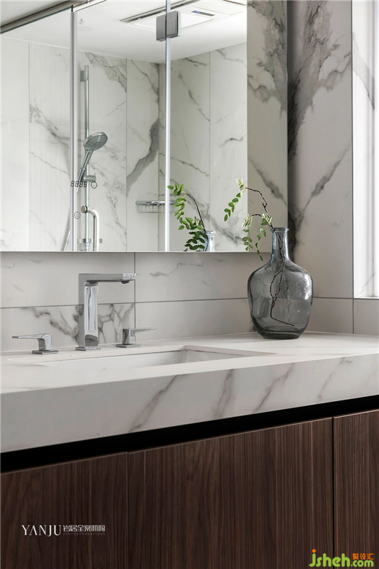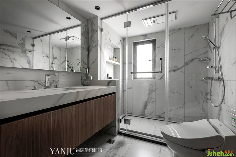 全白的衛(wèi)生間,讓空間更為立體和干凈。同其他空間色系相同的木質(zhì)豐富了衛(wèi)生間的材質(zhì)表現(xiàn)。