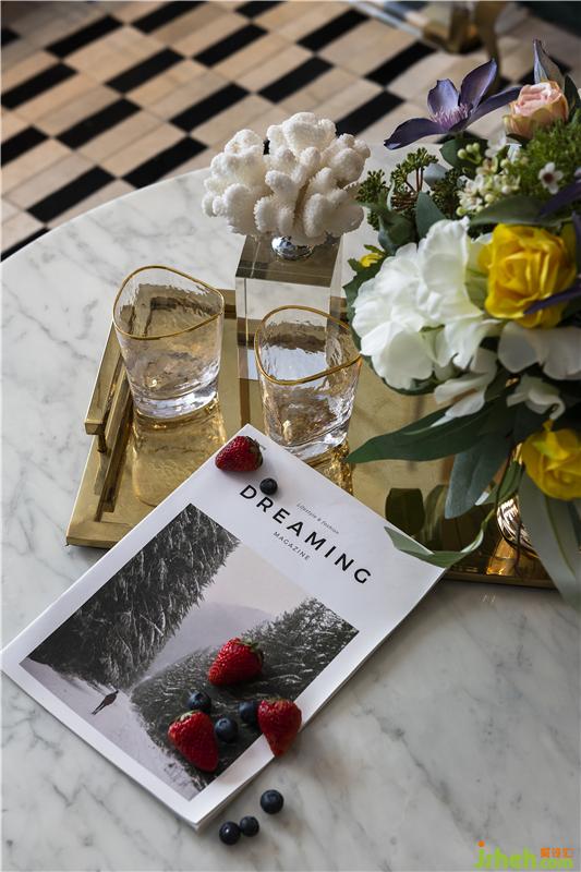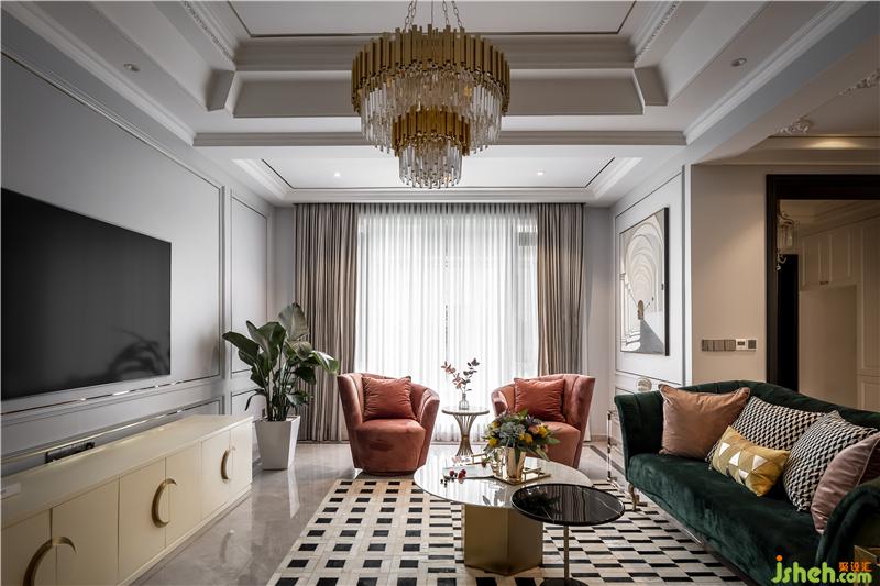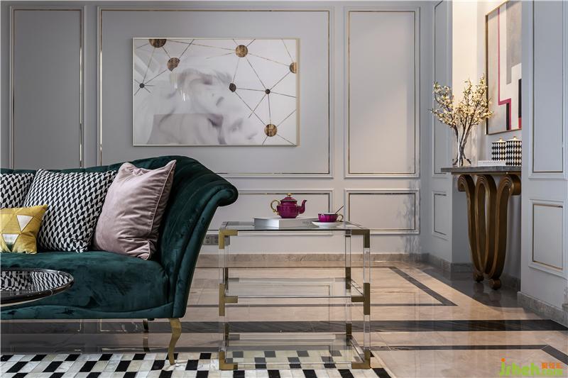 客廳選用靜謐淡藍(lán)和高貴金為主色調(diào),搭配皮粉及墨綠色沙發(fā),形成淡雅與尊貴的視覺沖擊。