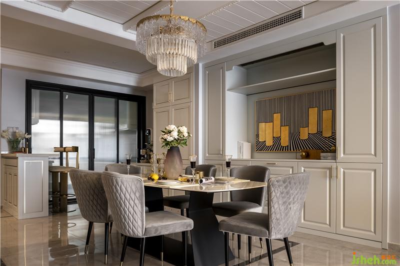 餐廳呈現(xiàn)的是冷暖相間的色彩,頂面優(yōu)美的線條,搭配圓形吊燈,置身其中感受到的是空間本身帶來的美.