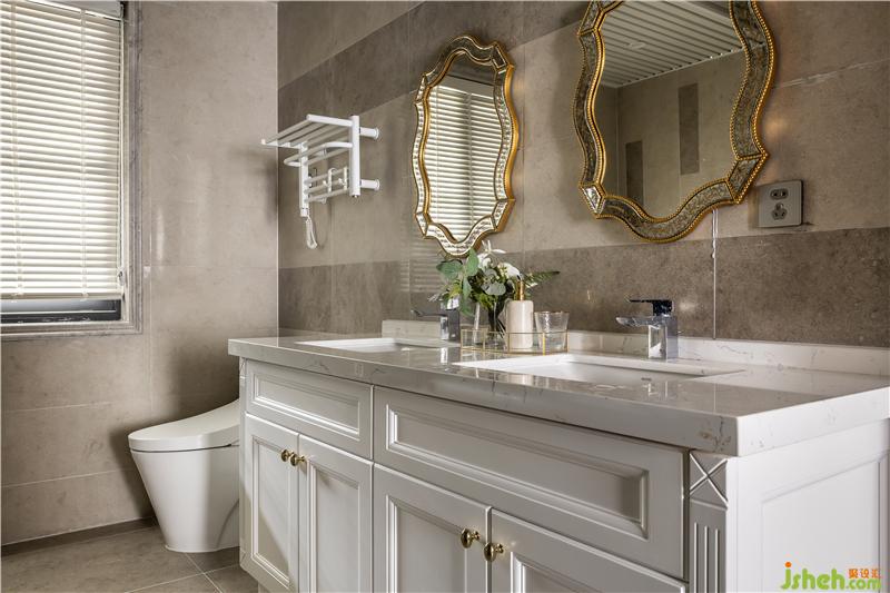 米灰色地磚搭配白色浴柜,營造出簡潔大氣的空間效果。金屬色的浴鏡,增加了空間的奢華格調(diào),花邊造型進(jìn)一步演繹著法式的浪漫與優(yōu)雅。