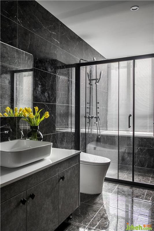 衛(wèi)浴空間干練簡(jiǎn)潔,墻面磚與地磚同色系搭配,在視覺(jué)上達(dá)到了擴(kuò)大空間的效果。
