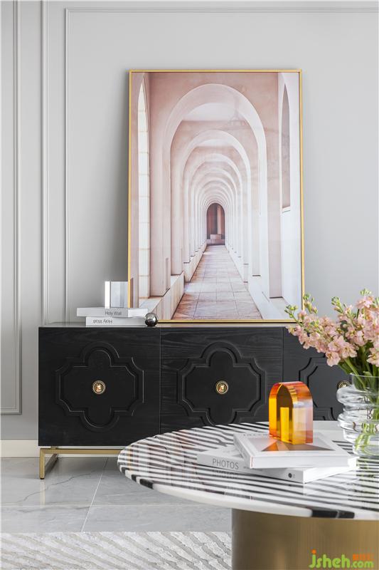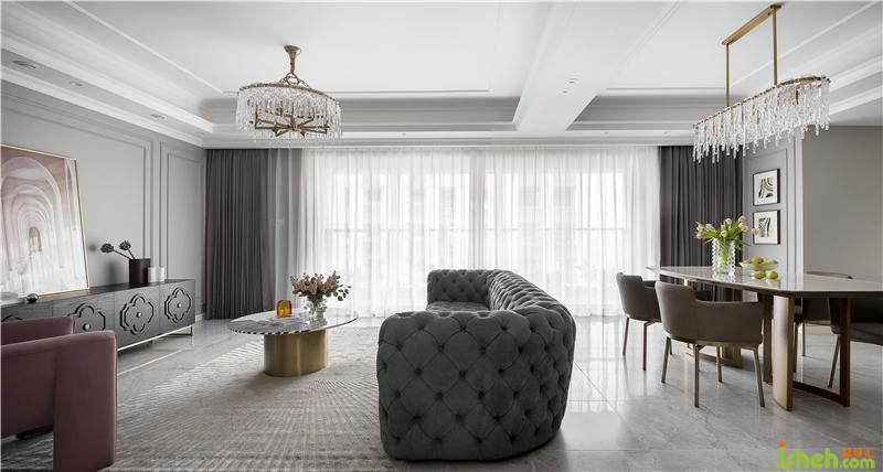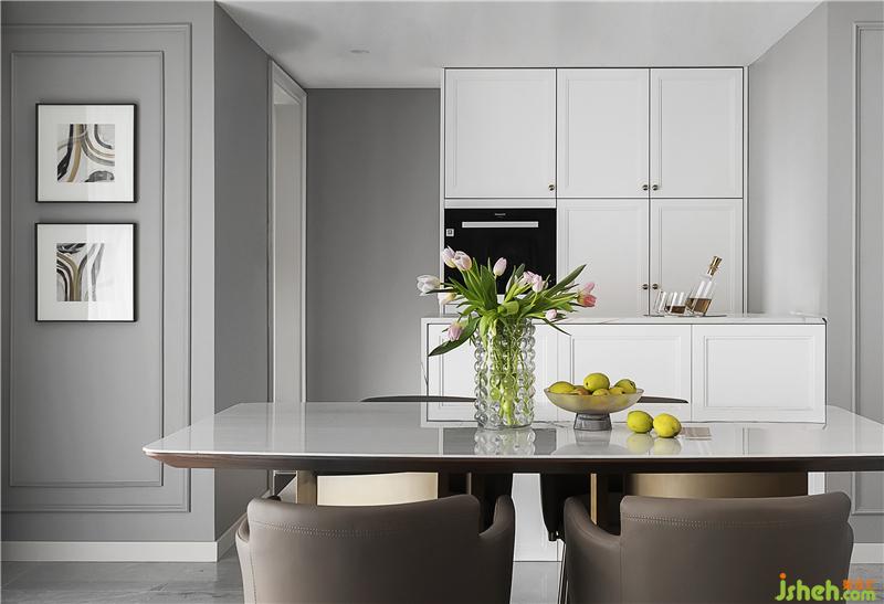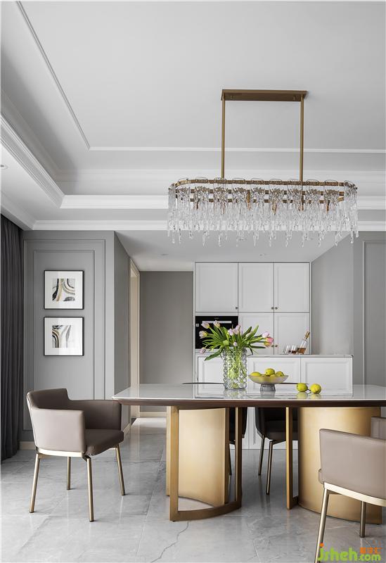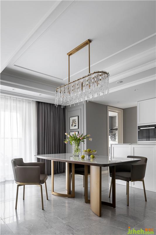 白色水晶吊燈大氣又干凈,結(jié)合金屬材質(zhì)餐桌,餐廳空間輕奢含蓄而不浮夸。