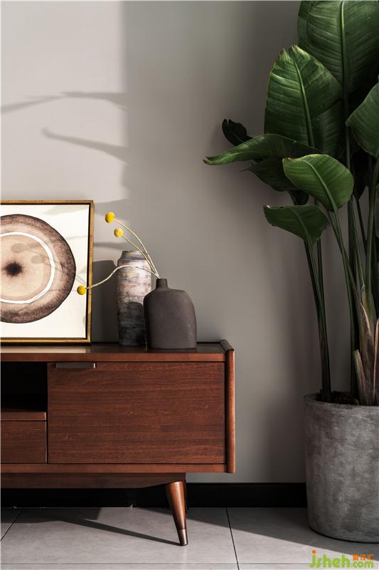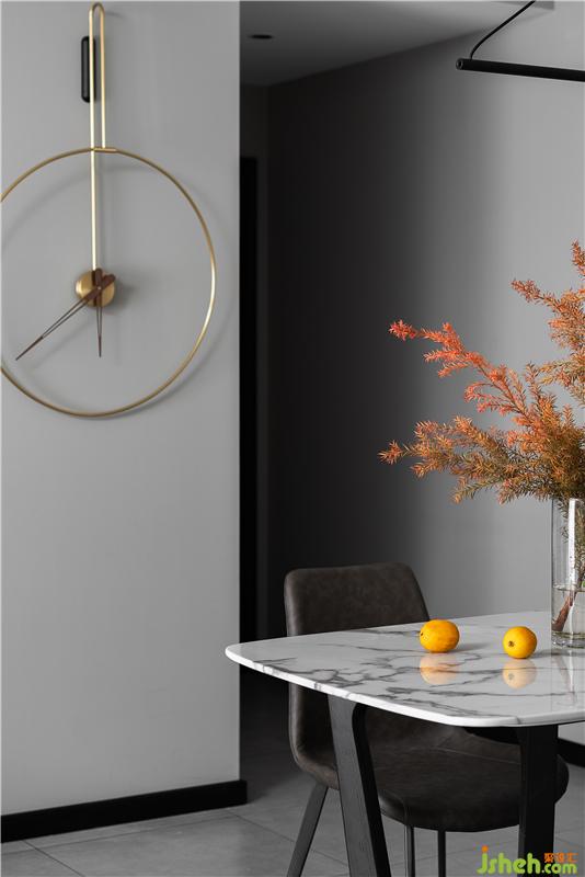客廳的大落地窗讓室外的景色透進(jìn)來(lái),整個(gè)空間更加明亮、通透。泡上一壺茶,用心感受遲暮與朝霞的魅力。懸掛在墻上的圓形個(gè)性裝飾鐘,為客廳平添了一絲藝術(shù)氣息。
