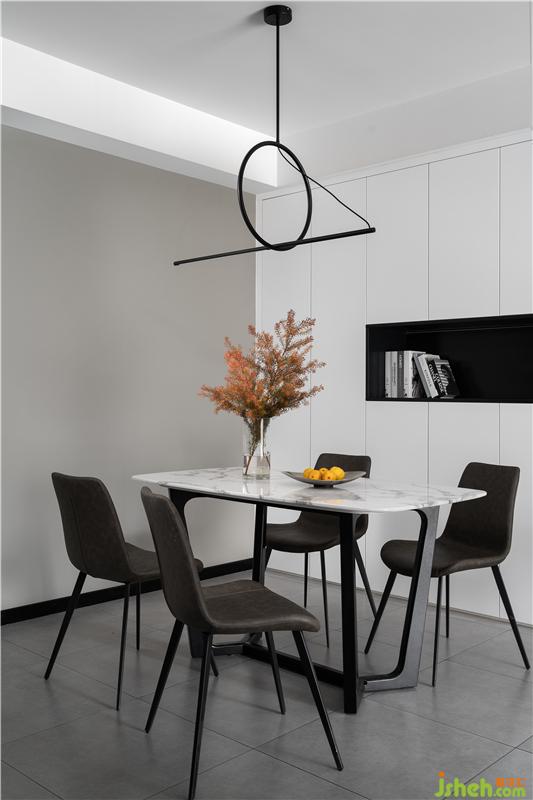 幾何一字型創(chuàng)意藝術(shù)吊燈簡(jiǎn)潔又不失大方,裝修設(shè)計(jì)搭配大理石餐桌,更具活力。餐邊柜與儲(chǔ)物柜結(jié)合,既能作為家庭儲(chǔ)物收納也能作為飾品展示區(qū)域,美觀實(shí)用。
