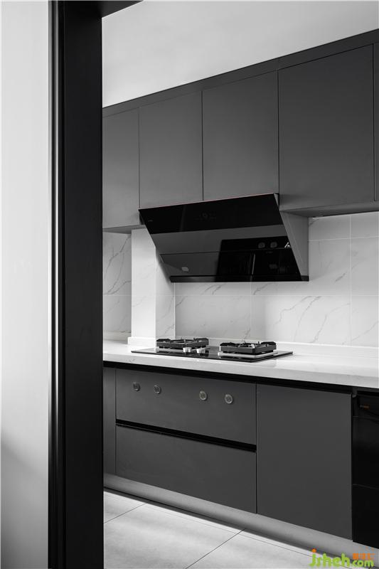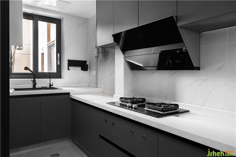 l型廚房沿用了大理石瓷磚,搭配灰色櫥柜,層次分明,視覺上充滿流暢的美感,也增強了廚房的兼容性。