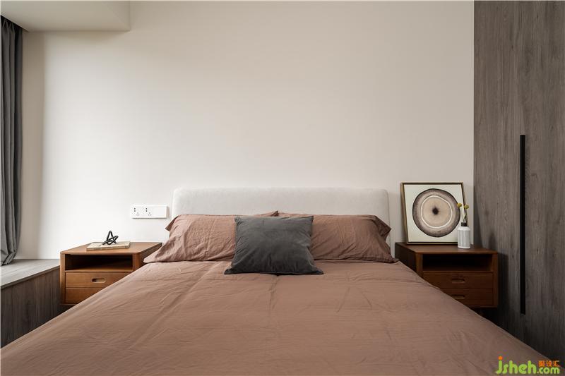 主臥室采用了水泥漆背景墻,胡桃色的裝飾畫與床品相呼應,皮質軟包的床頭造型、黑色的吊燈,為睡眠空間點綴了一些工業(yè)風,簡單且富有神秘感。