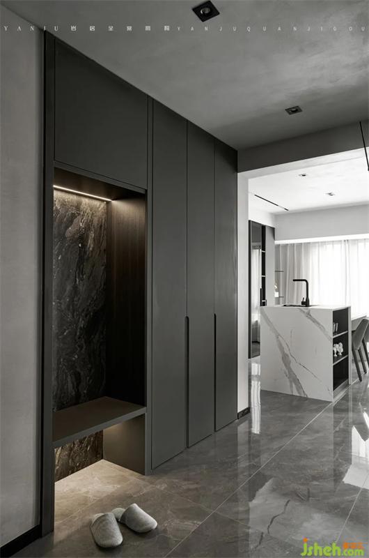 深灰色鞋柜配以仿石材紋理的飾面,輔以柔和的銑型拉手和感應(yīng)燈光,質(zhì)感不失自然,硬朗不失柔和。