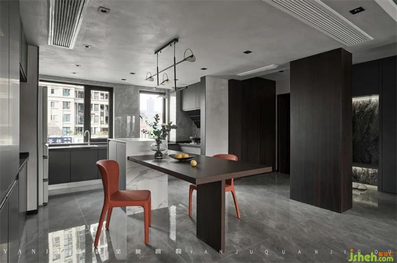 島臺和餐桌融合定制,高低深淺的搭配讓空間層次更立體,橘色餐椅的加入讓灰色的空間靈動(dòng)活潑起來。西廚島臺的木飾面上,用天然木皮來替代科技木皮,視覺效果更自然柔和。