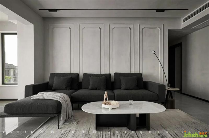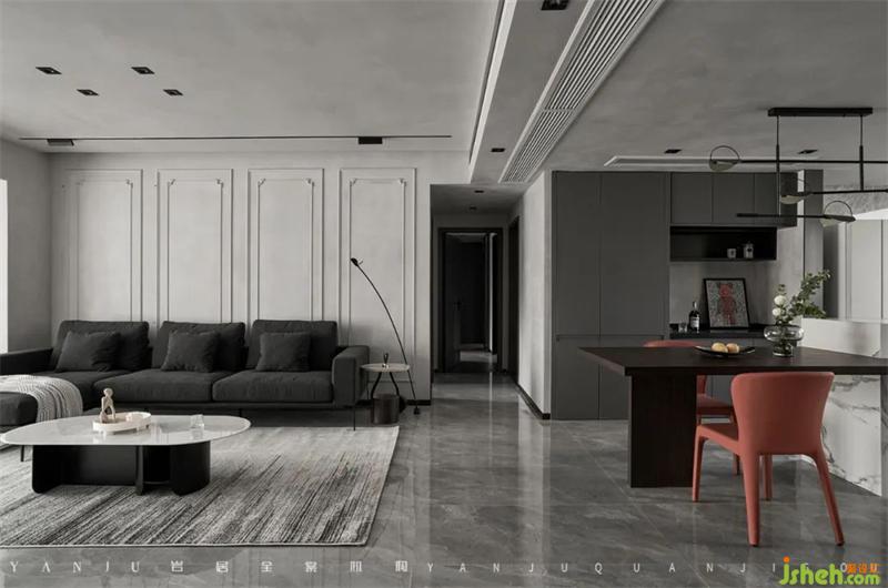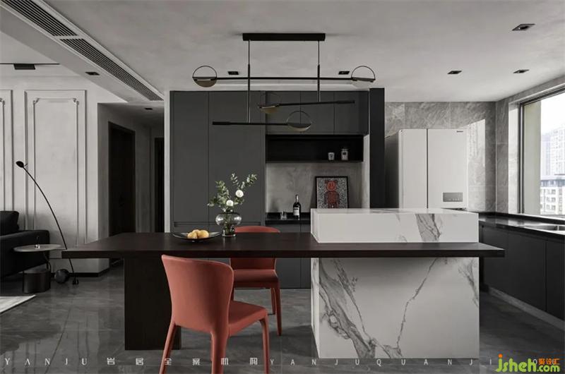 在色彩搭配上,整體空間以飽和度低的淺灰色為背景,主題色為深灰,以白色巖板做對比色來提亮空間,用煙熏木紋做為下沉色,讓空間更顯細(xì)膩和具有溫度。