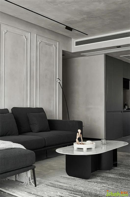 In terms of color matching, the overall space is based on low-saturation light gray, the theme color is dark gray, white slate is used as a contrast color to brighten the space, and the smoked wood grain is used as the sink color to make the space more visible Delicate and warm.