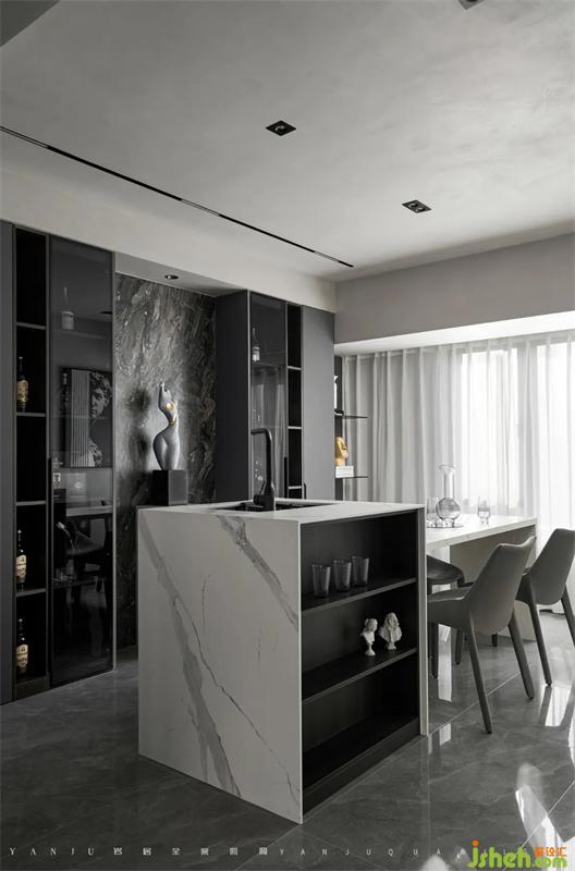 休閑區(qū)的色調(diào)保持與公區(qū)色調(diào)的一致,酒柜拋棄整壁的柜子,以局部開放的展示柜結(jié)合燈光層板呈現(xiàn)。主要氛圍燈也設置在休閑區(qū),朋友喝酒聚會時,能讓休閑區(qū)在整體空間上獨樹一幟,擁有不一樣的氛圍。