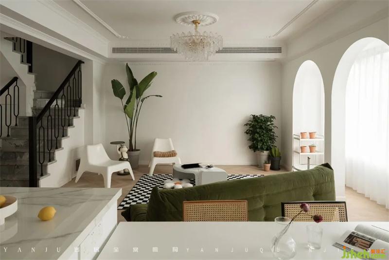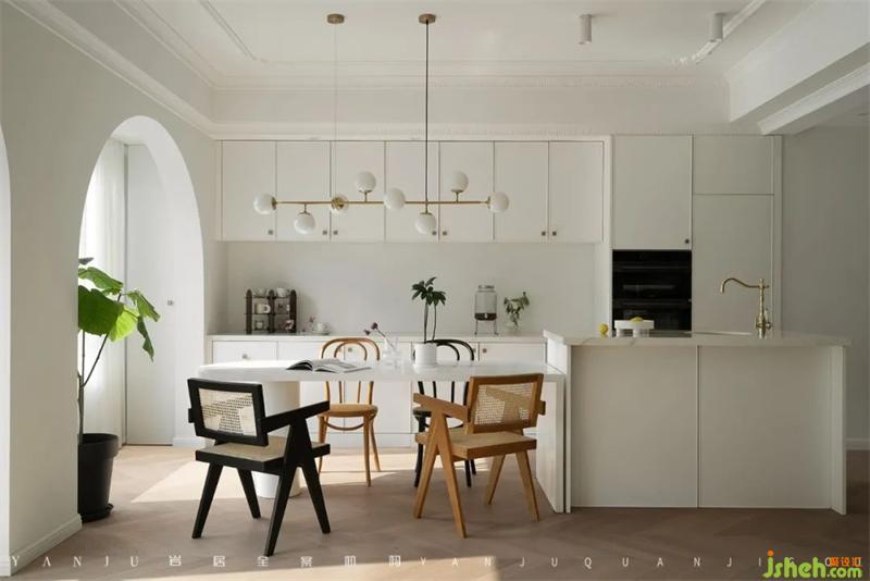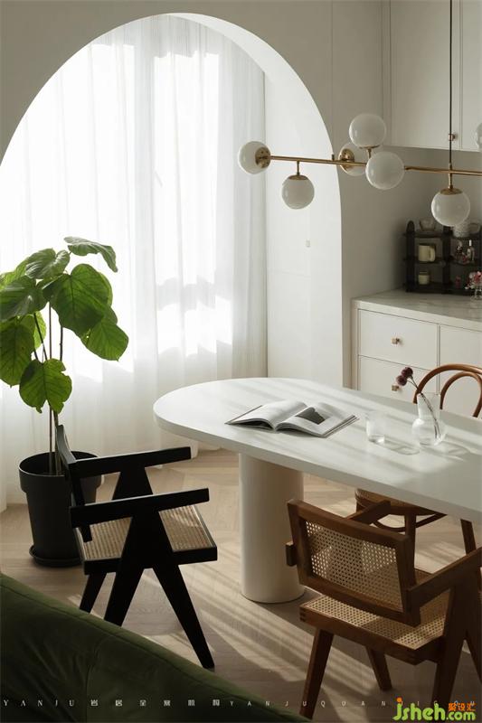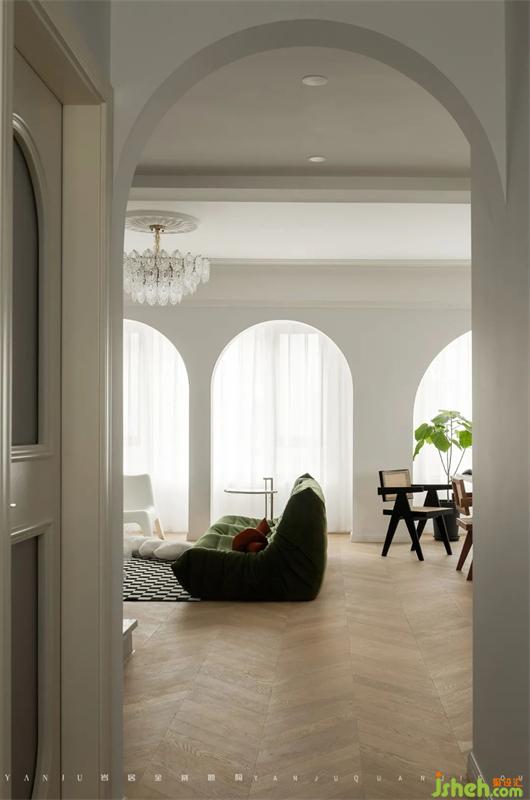連接玄關(guān)與客餐廳的門洞設(shè)計成了拱形,與客廳的造型相呼應(yīng), 增添空間的層次感和古典韻味。