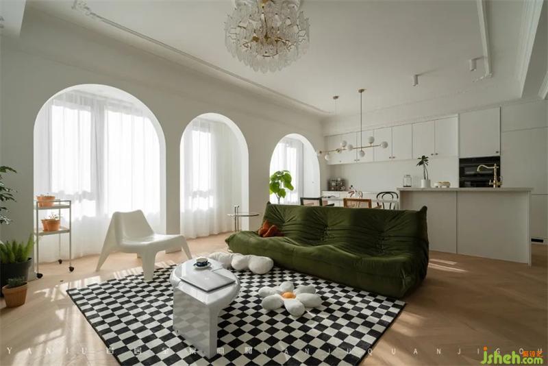復(fù)式設(shè)計客餐廳保留了原始的橫廳結(jié)構(gòu),拆除了原有飄窗,改為三個拱形門洞,增加光影結(jié)構(gòu)和層次感,為兩個寶貝打造了一個可以躲貓貓的童趣空間;同時取消了電視柜和茶幾,給小朋友留下足夠的玩??臻g。