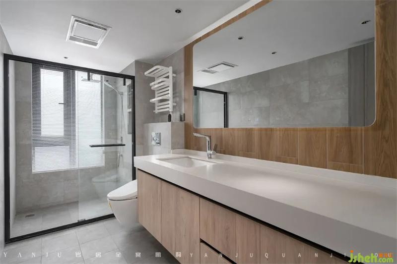 主衛(wèi)的鏡柜和浴室柜都非常實用,前者附有燈帶,后者柜門穩(wěn)重大方,可以收納一些小物件,方便實用。
