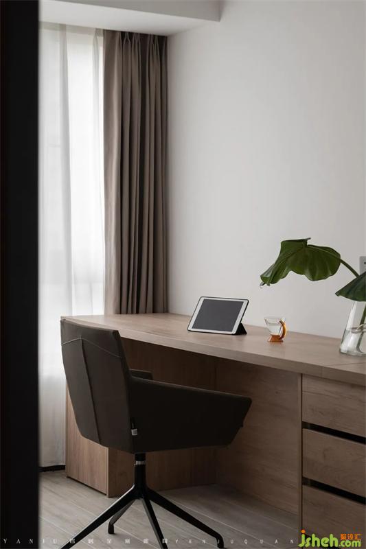 書房擁有大大的落地窗,盡可能地納入陽光。書桌背面定制了書柜方便收納,合理利用空間,自然而不局促。