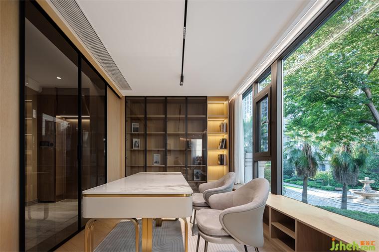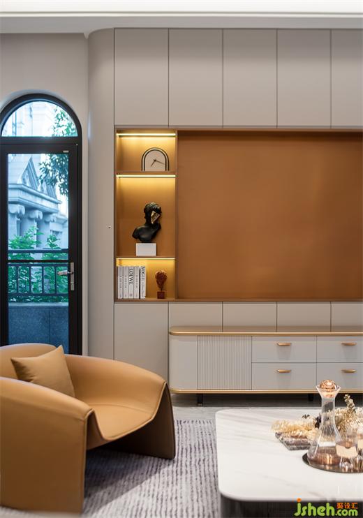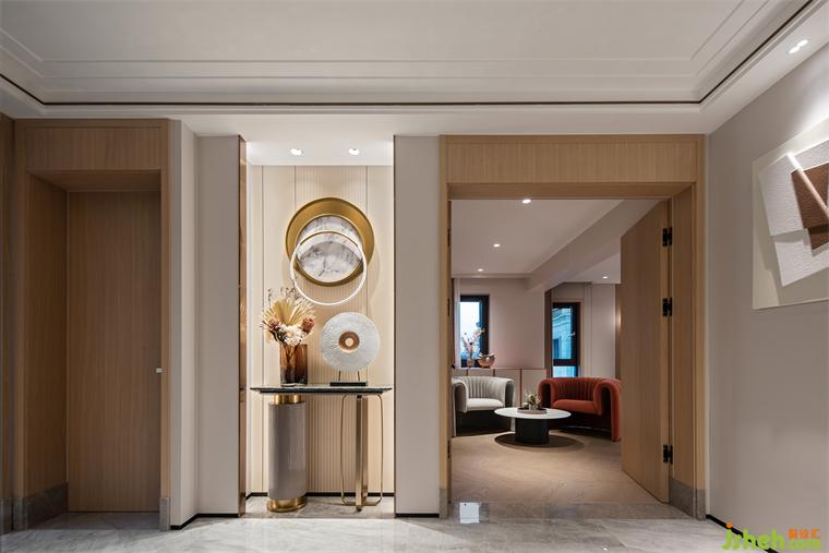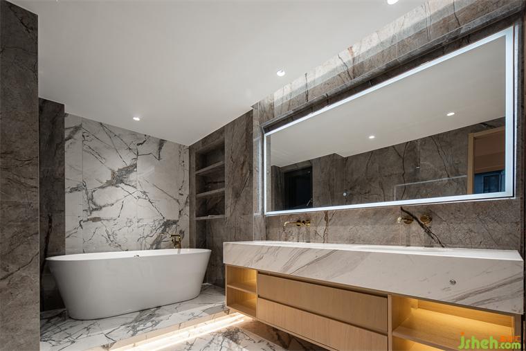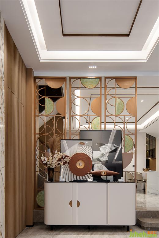 別墅設計的藝術便在于空間中激發(fā)人們對于生活本身的感知,賦予重復日常細膩恒久的觸動。我們在入口處置入一個玄關,原本“開門見山”的大尺度有了視覺遮擋,壁爐的蜿蜒火光卻能隨著人的行動蔓延,描摹生活的節(jié)奏,強烈而有生機。從踏入玄關的那刻起,便進入一個優(yōu)雅而自由的世界,石材的質(zhì)感與多重燈光層次相互輝映。