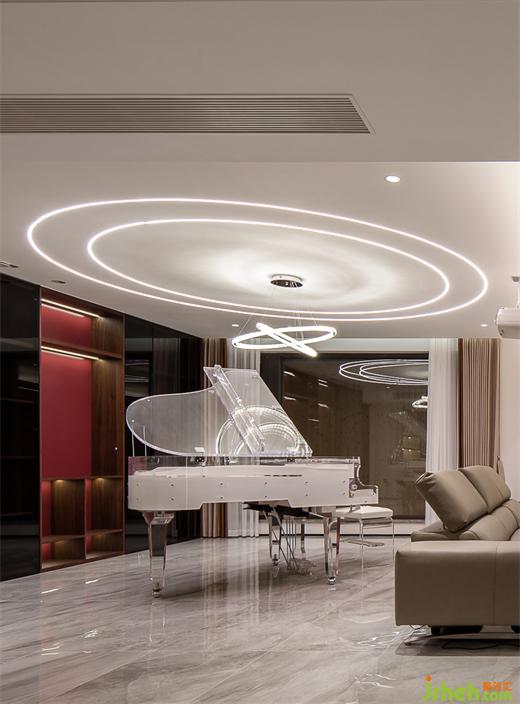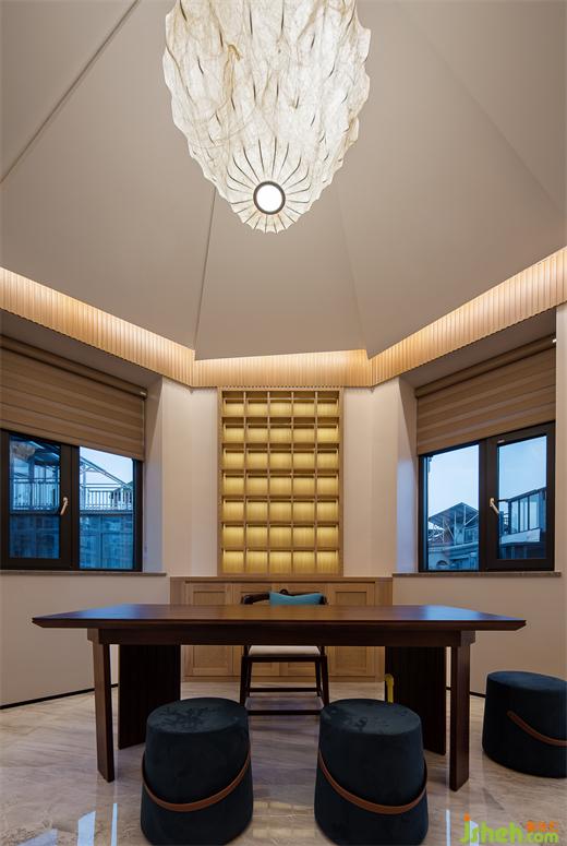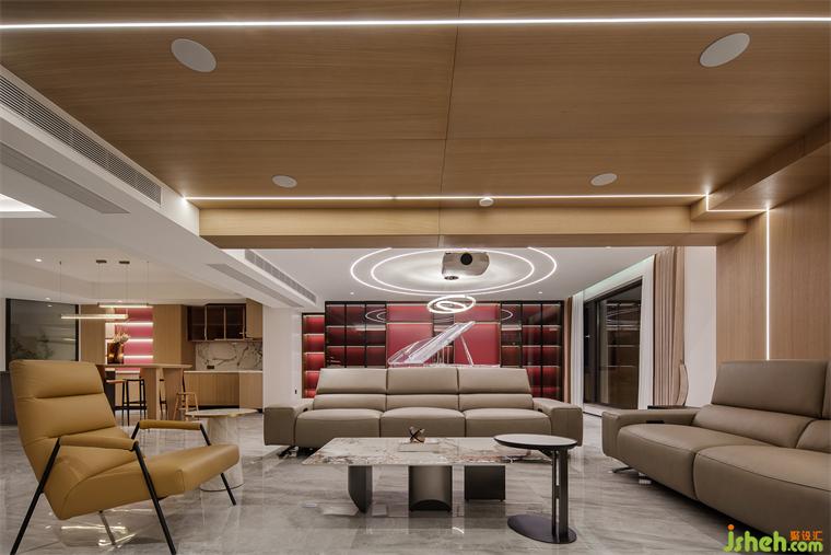 別墅設計功能收納被放進柜體和島臺內,兼顧展示與隱藏的需求。
